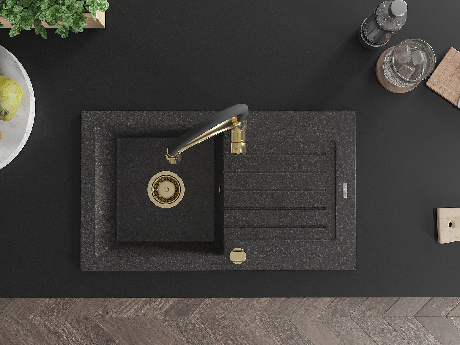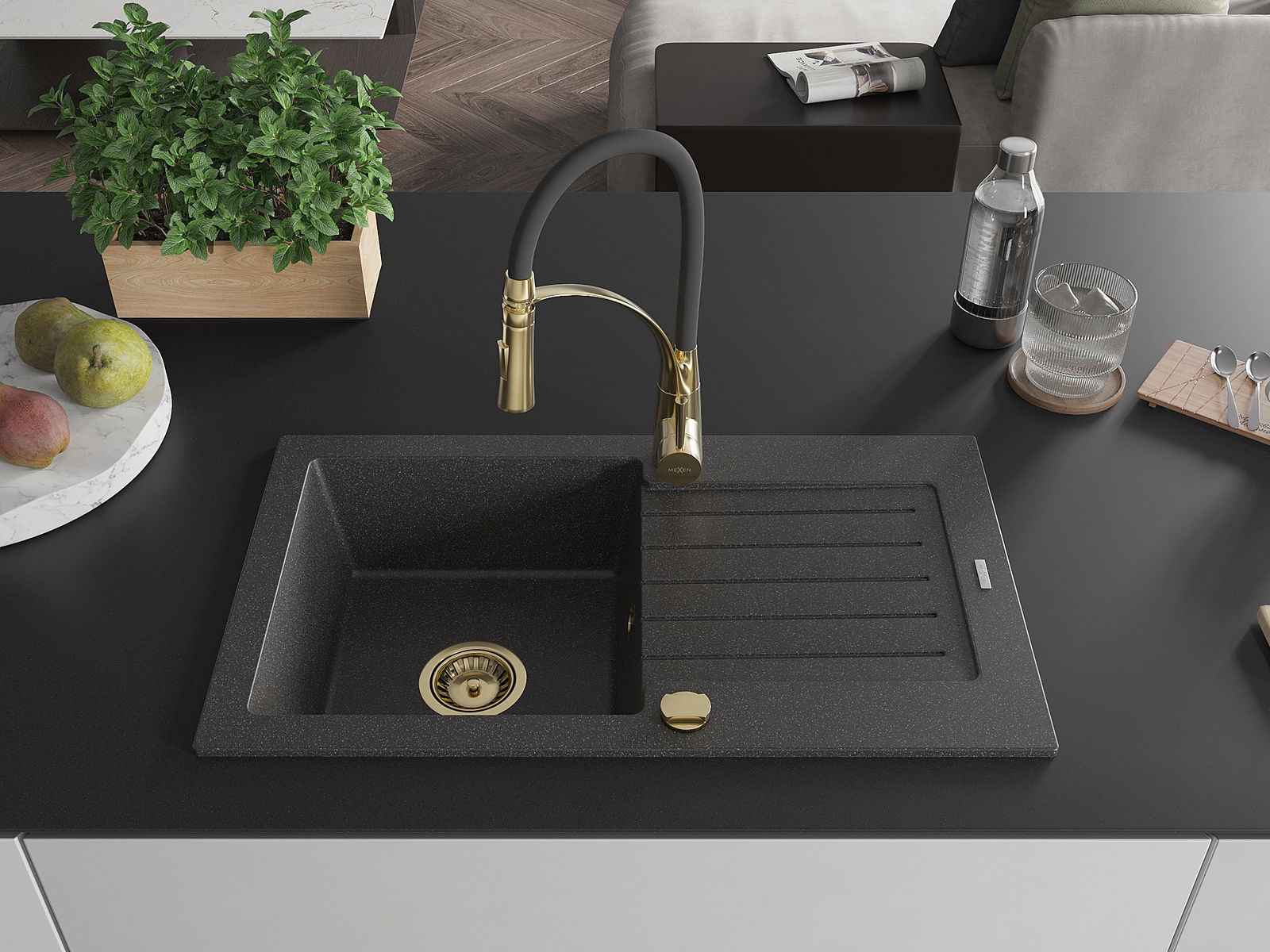 Mexen Pablo lavello in granito a 1 vasca con scolapiatti e rubinetto da cucina Aster, nero maculato - 6510-76-73450-57-G