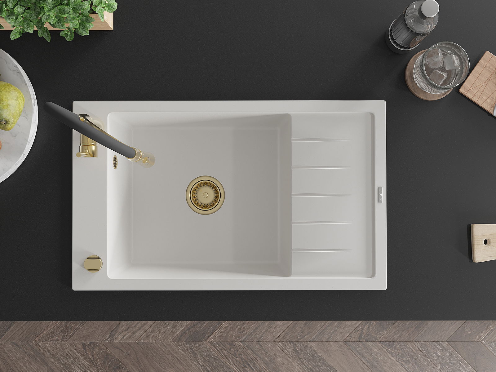 Mexen Elias lavello in granito con 1 vasca e sgocciolatoio e rubinetto da cucina Aster, bianco - 6511-20-73450-57-G
