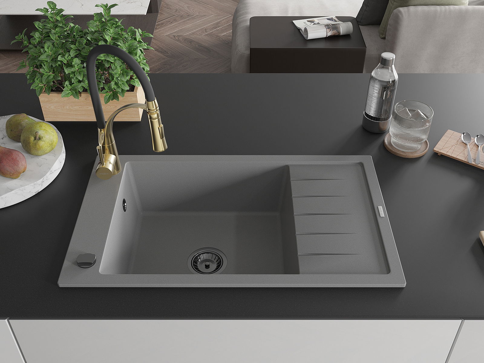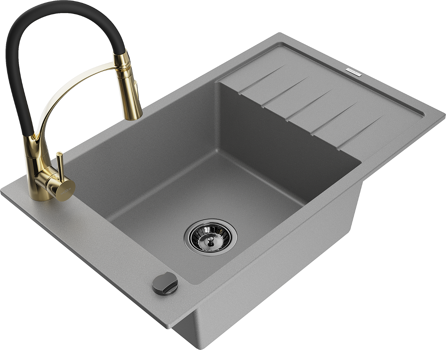 Mexen Elias lavello in granito 1-vasca con sgocciolatoio e rubinetto da cucina Aster, grigio - 6511-71-73450-57-B