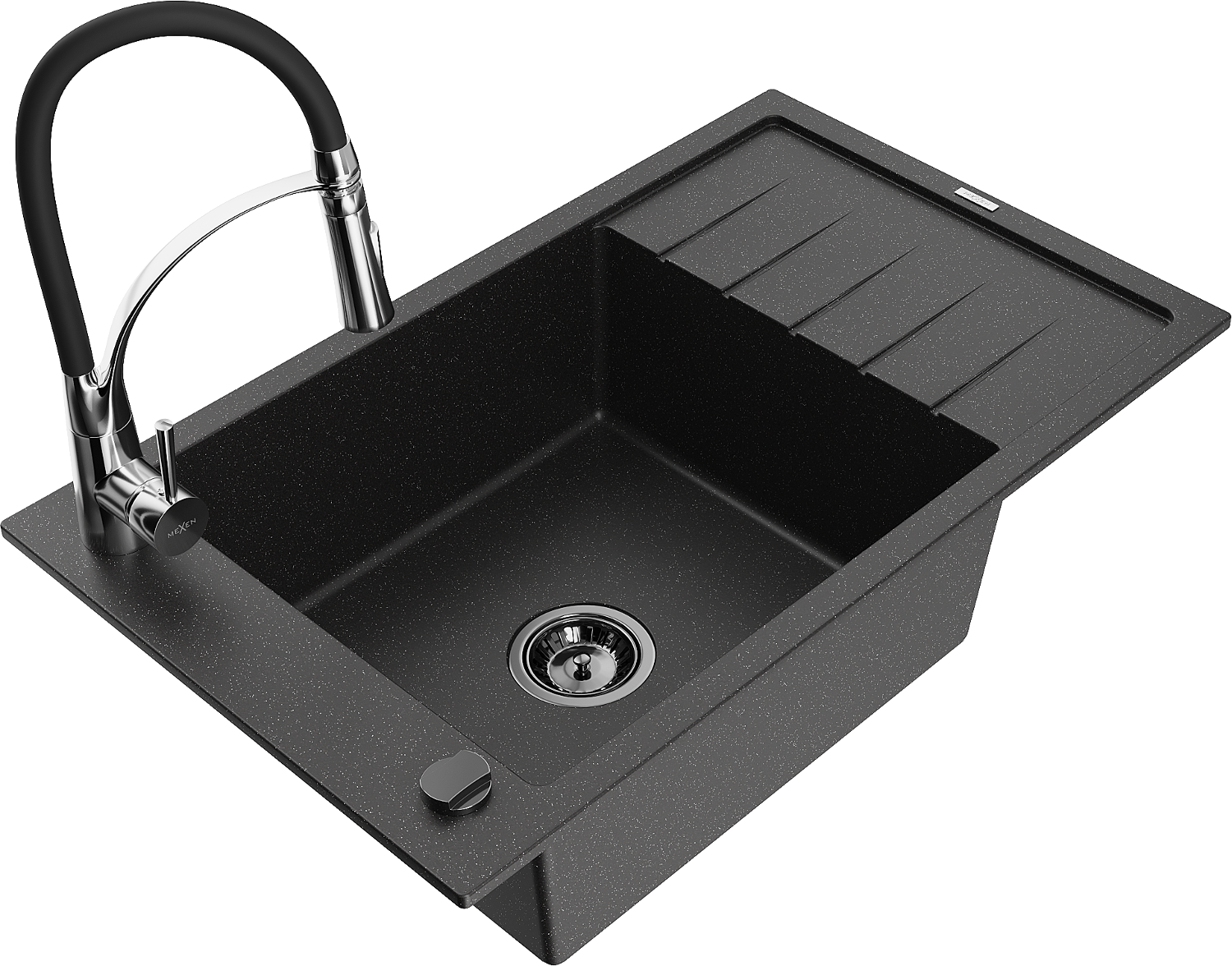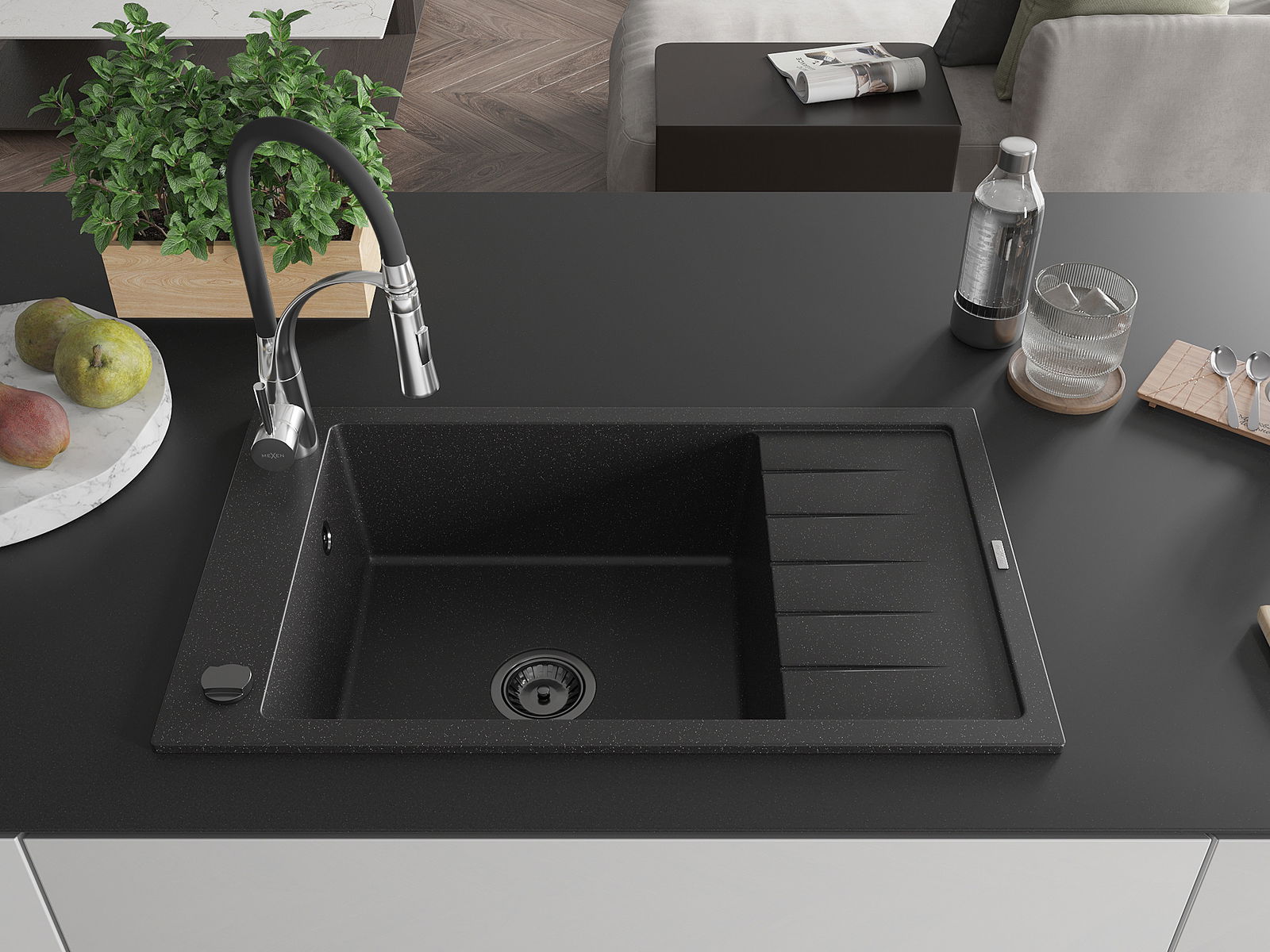 Mexen Elias lavello in granito a 1 vasca con scolapiatti e miscelatore cucina Aster, nero/metallico argento - 6511-73-73450-07-B