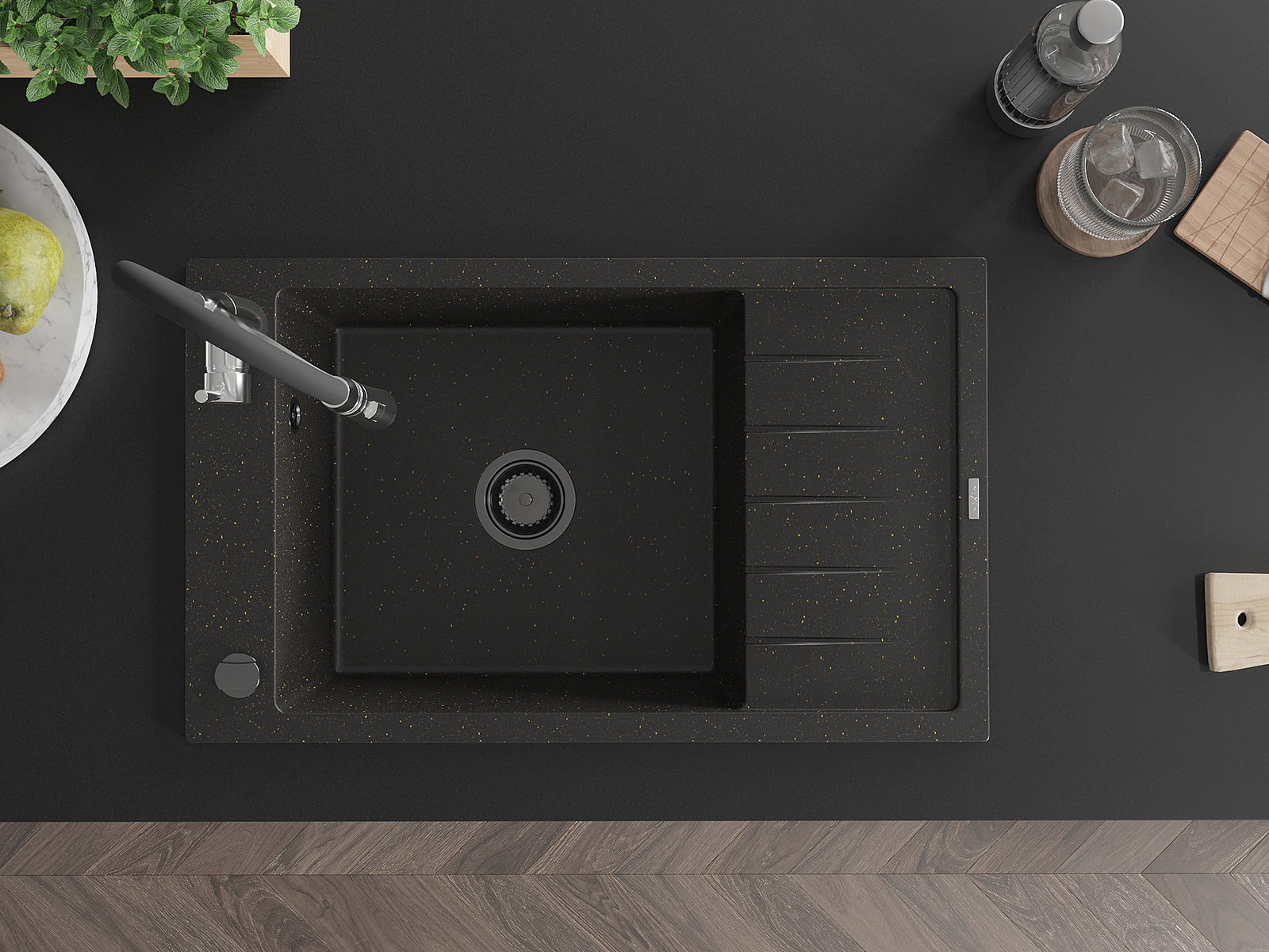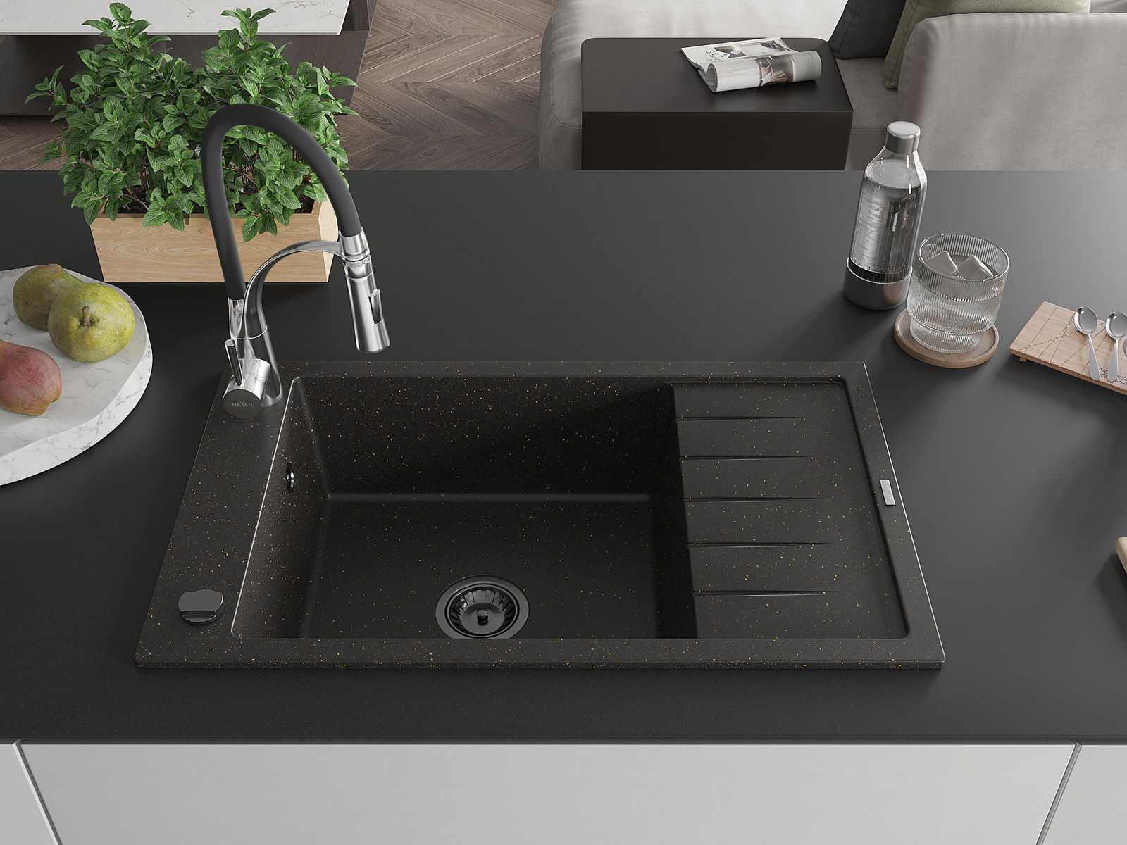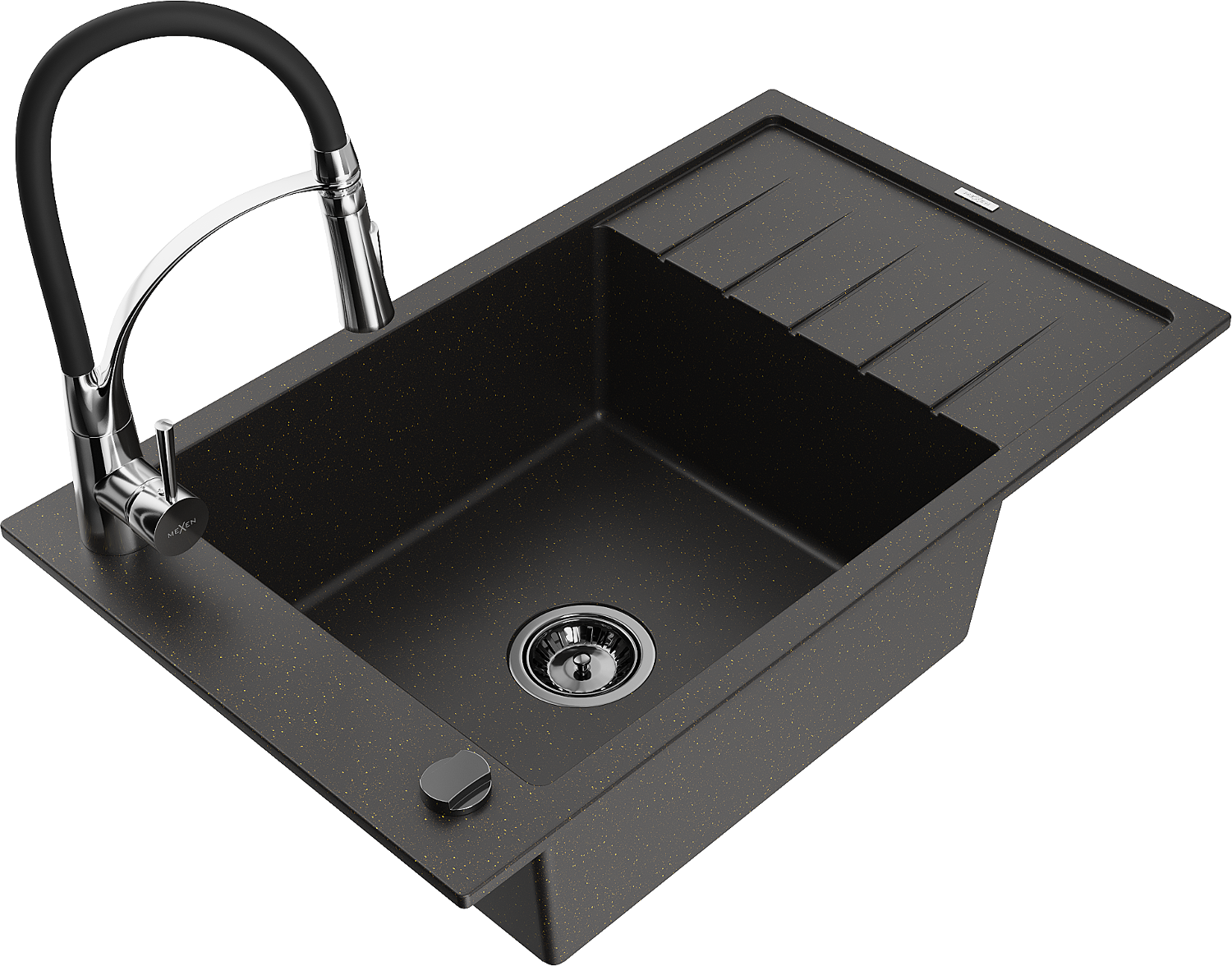 Mexen Elias lavello in granito a 1 vasca con scolapiatti e rubinetto cucina Aster, nero/oro metallizzato - 6511-75-73450-07-B