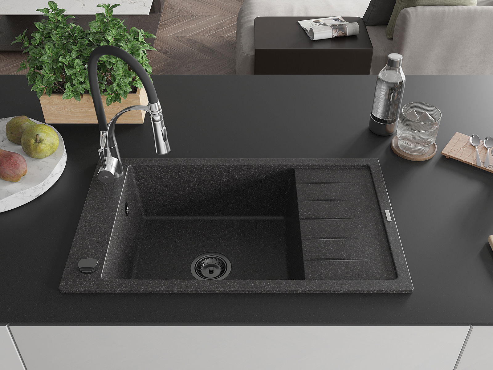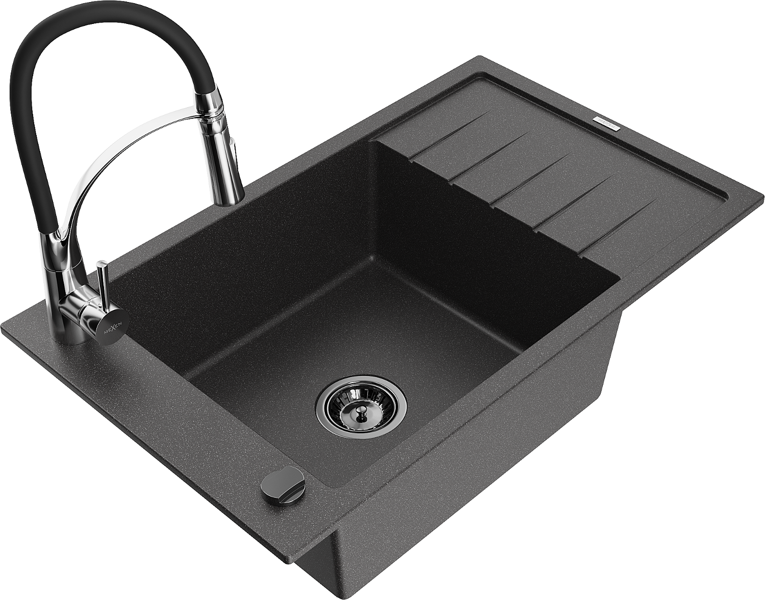 Mexen Elias lavello in granito a 1 vasca con sgocciolatoio e miscelatore cucina Aster, nero maculato - 6511-76-73450-07-B