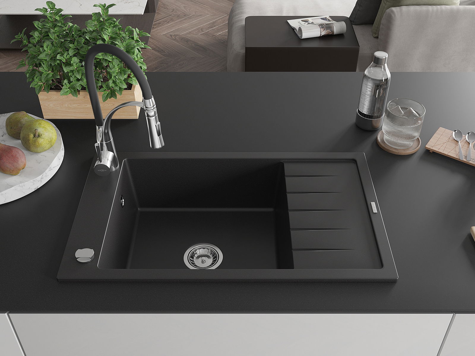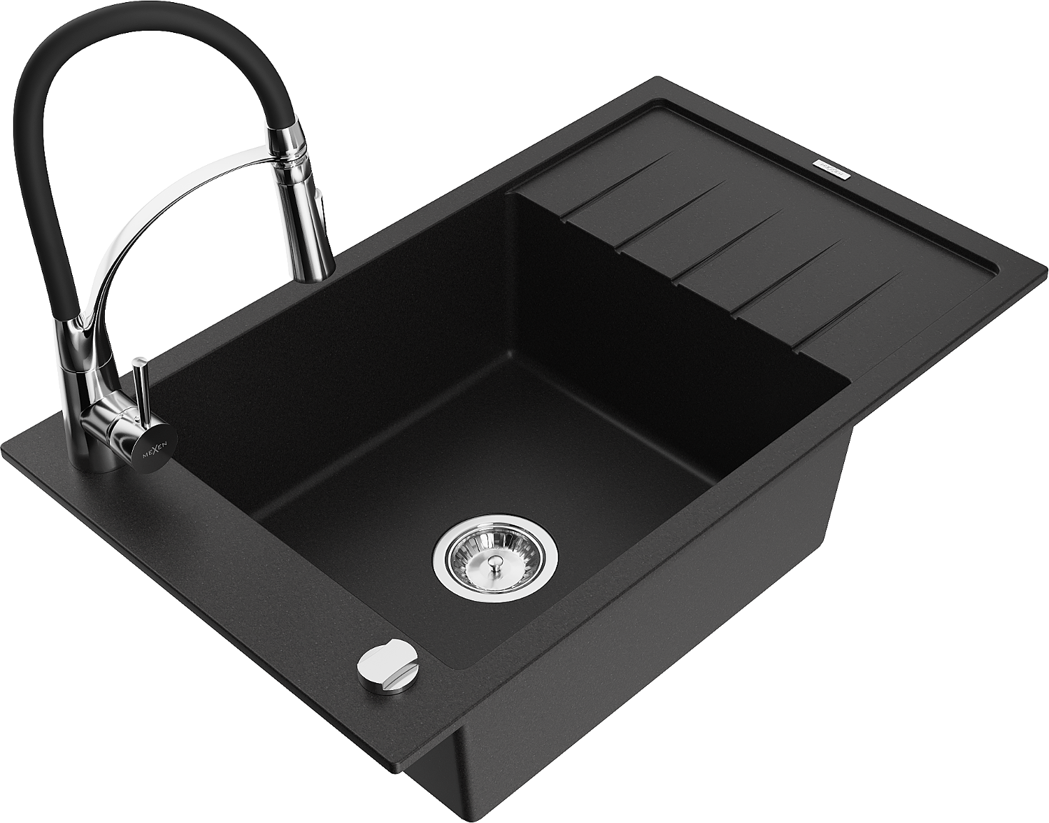 Mexen Elias lavello in granito a 1 vasca con scolapiatti e rubinetto da cucina Aster, nero - 6511-77-73450-07