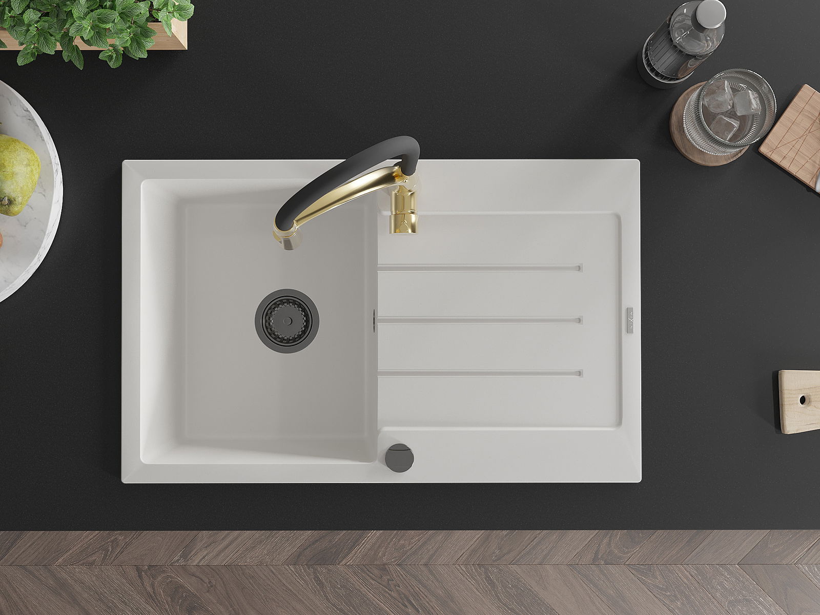 Mexen Bruno lavello da cucina in granito a 1 vasca con scolapiatti e rubinetto Aster, bianco - 6513-20-73450-57-B