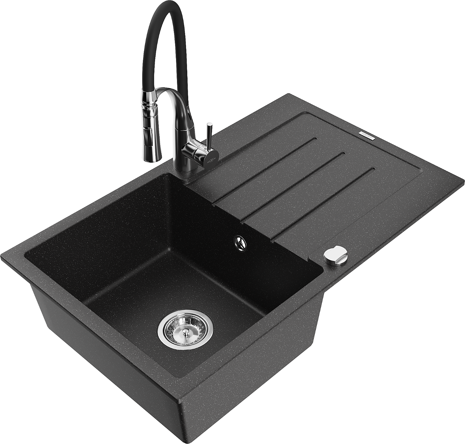 Mexen Bruno lavello in granito 1-bacino con scolapiatti e rubinetto da cucina Aster, nero/metallo argento - 6513-73-73450-07