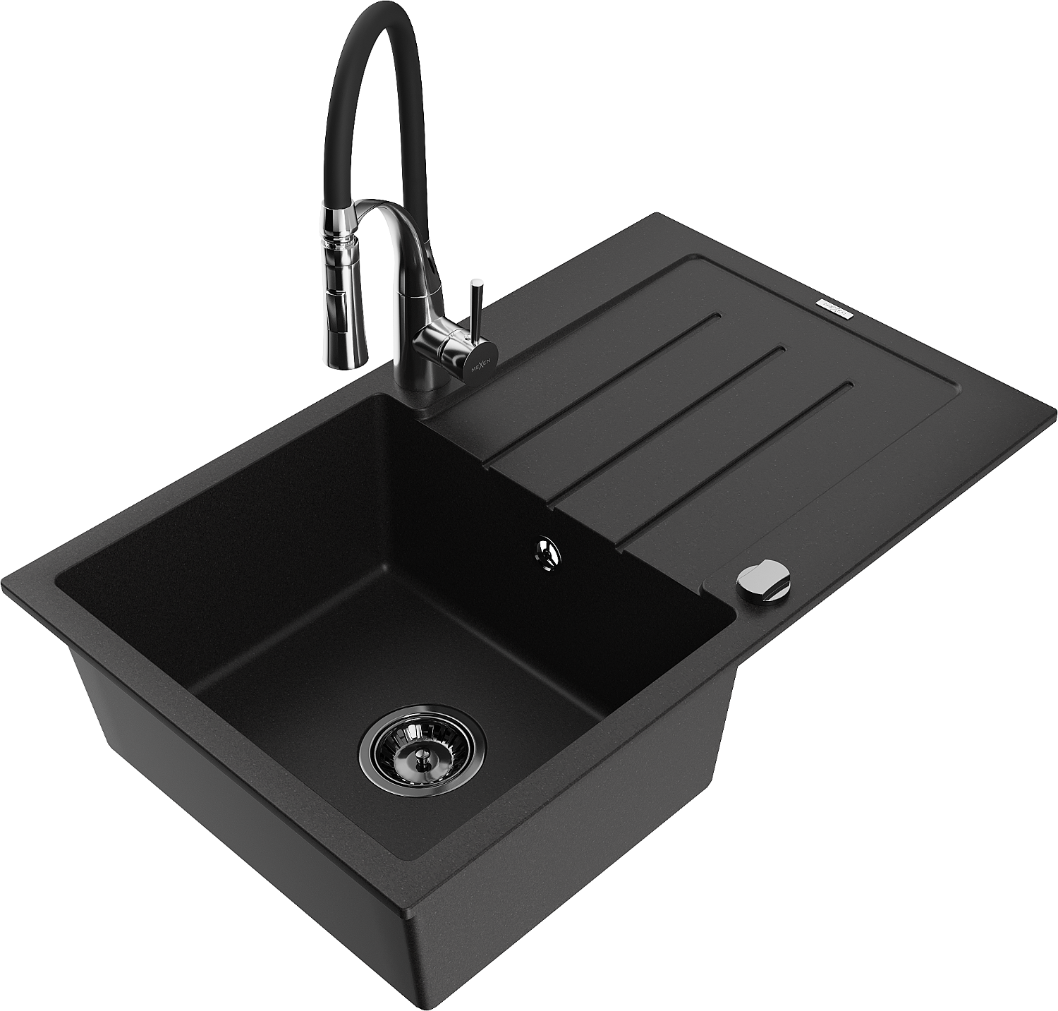 Mexen Bruno lavello in granito 1-vasca con scolapiatti e rubinetto cucina Aster, nero - 6513-77-73450-07-B
