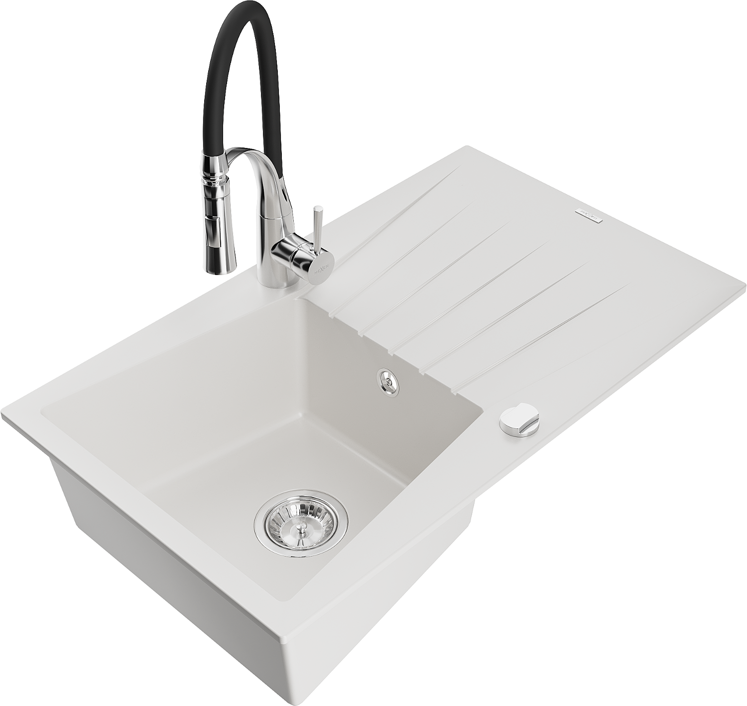 Mexen Cesar lavello da cucina in granito a 1 vasca con sgocciolatoio e miscelatore Aster, bianco - 6514-20-73450-07