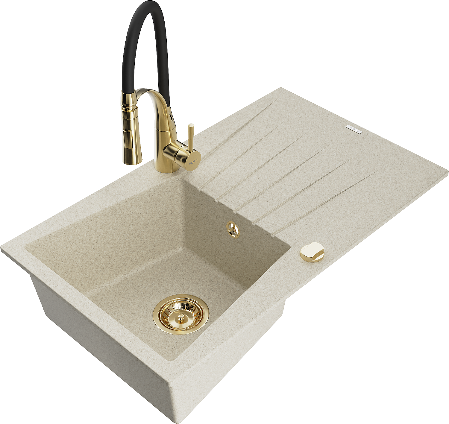 Mexen Cesar lavello da cucina in granito a 1 vasca con scolapiatti e rubinetto da cucina Aster, beige - 6514-69-73450-57-G