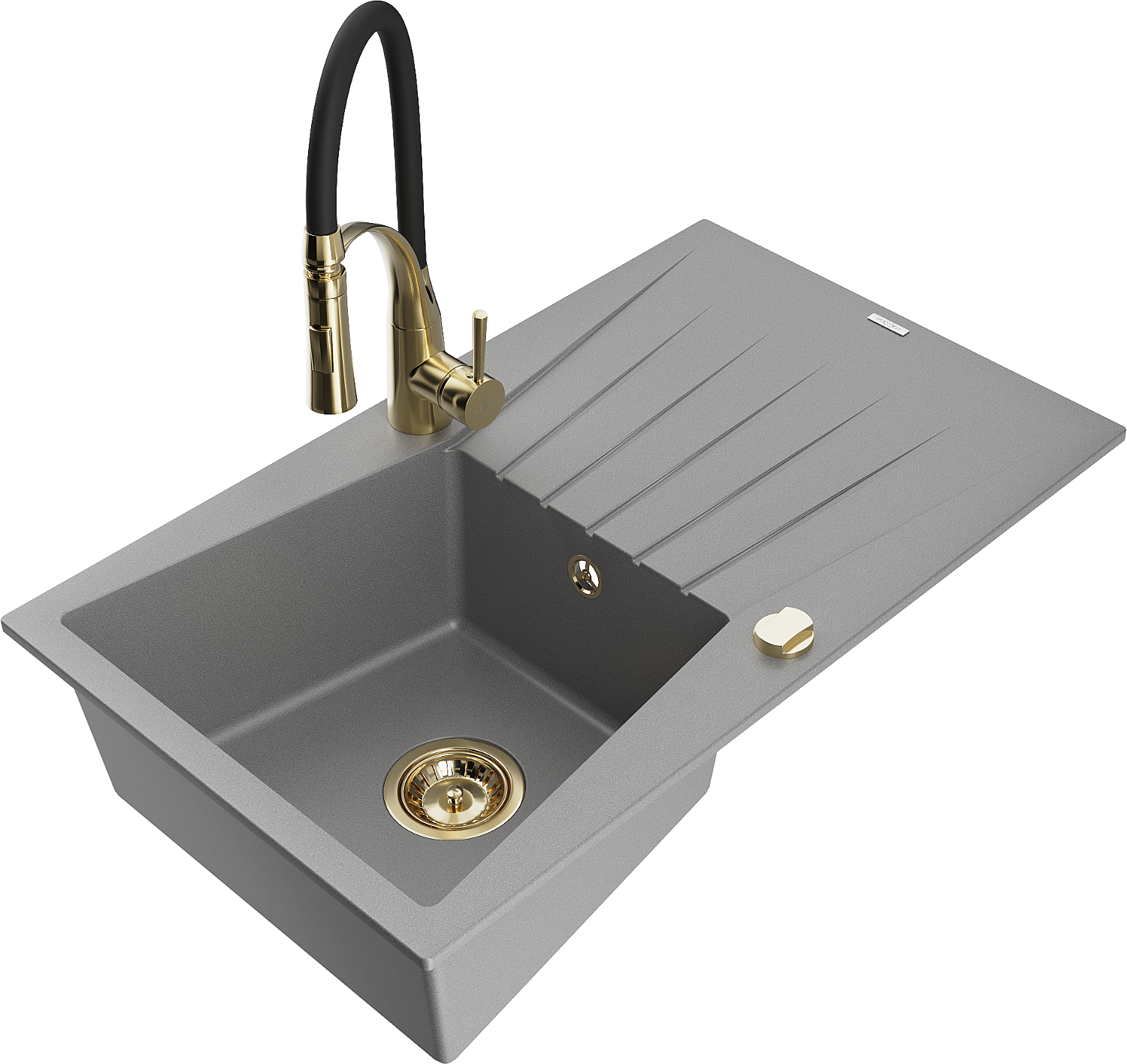 Mexen Cesar lavello in granito a 1 vasca con sgocciolatoio e rubinetto da cucina Aster, grigio - 6514-71-73450-57-G