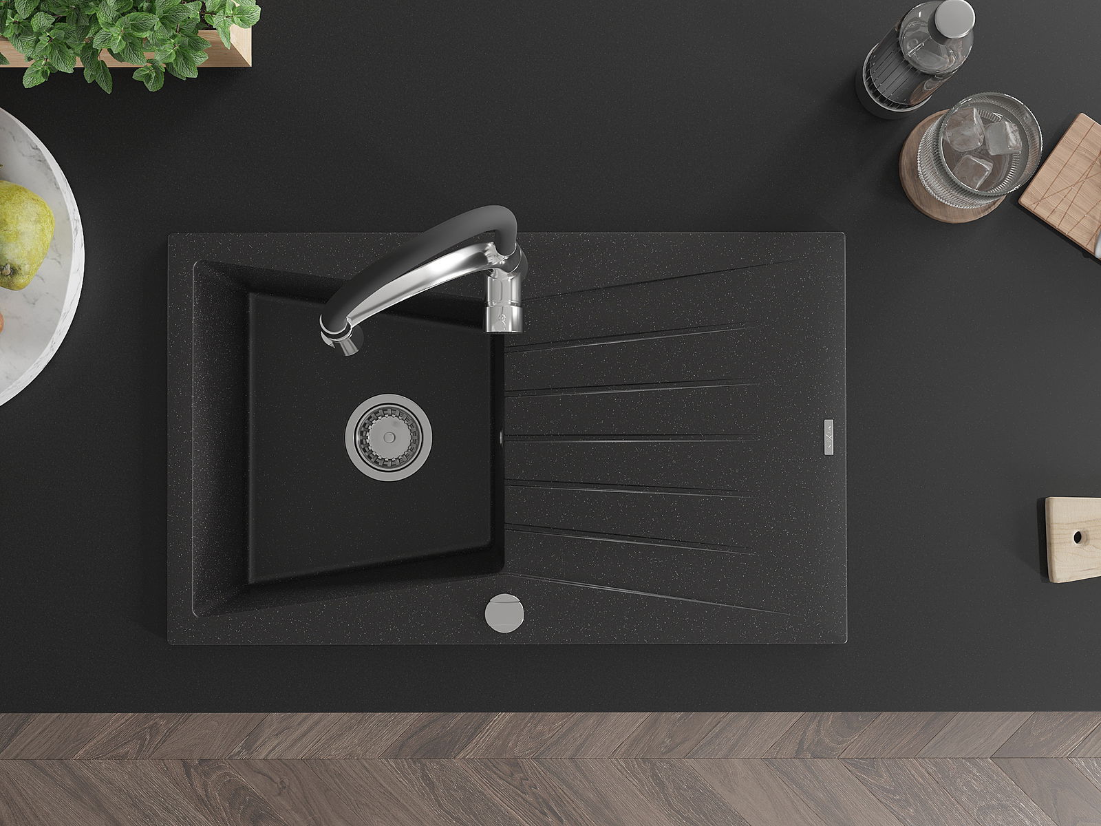 Mexen Cesar lavello in granito a 1 vasca con gocciolatoio e rubinetto da cucina Aster, nero/argento metallizzato