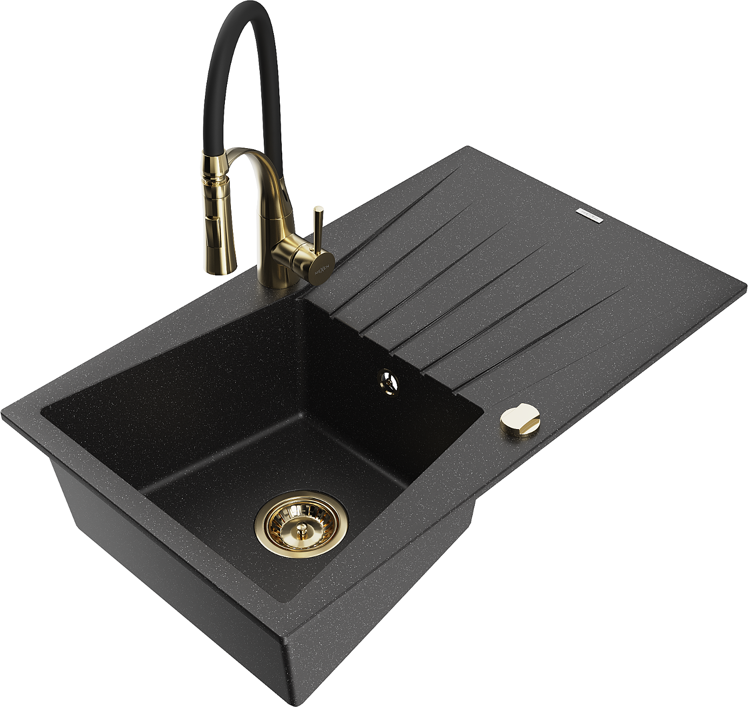 Mexen Cesar lavello in granito a 1 vasca con gocciolatoio e rubinetto da cucina Aster, nero/metallo argentato