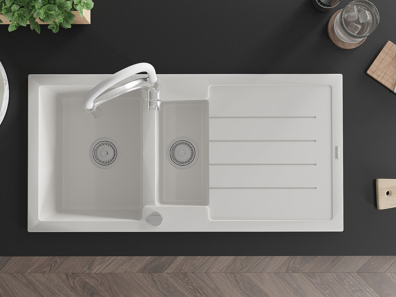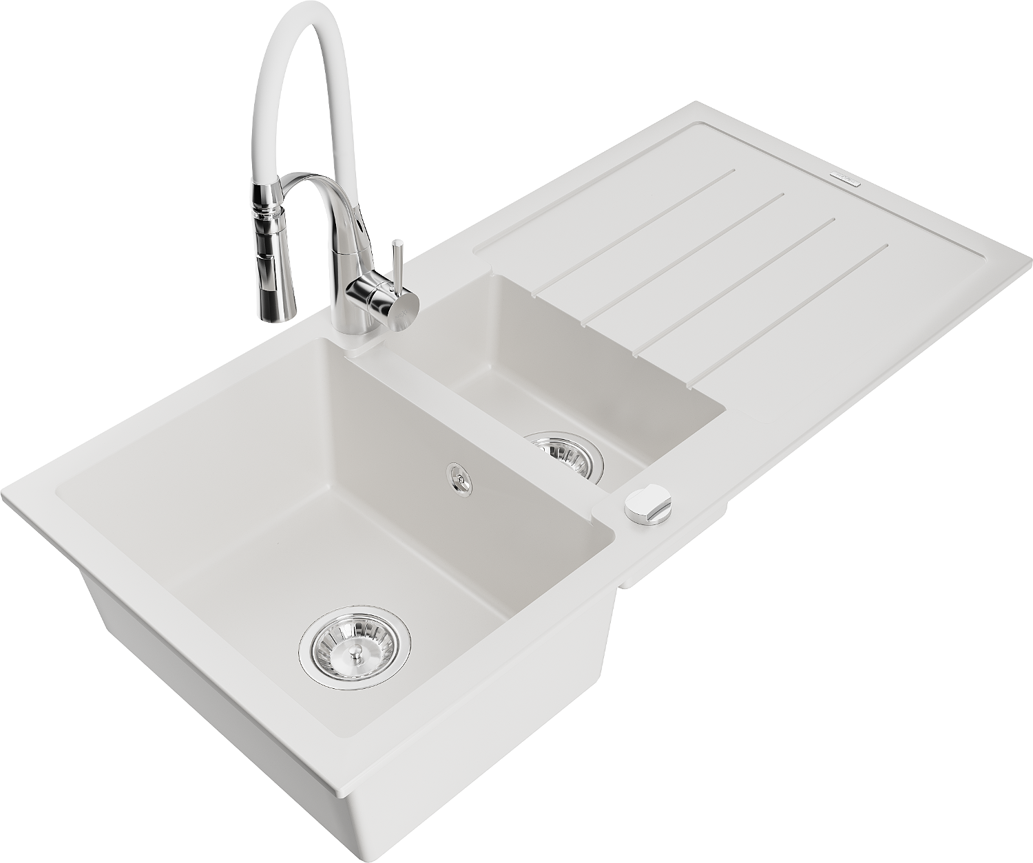 Mexen Andres lavello da cucina in granito 1,5 vasche con sgocciolatoio e rubinetto da cucina Aster, bianco - 6515-20-73450-02