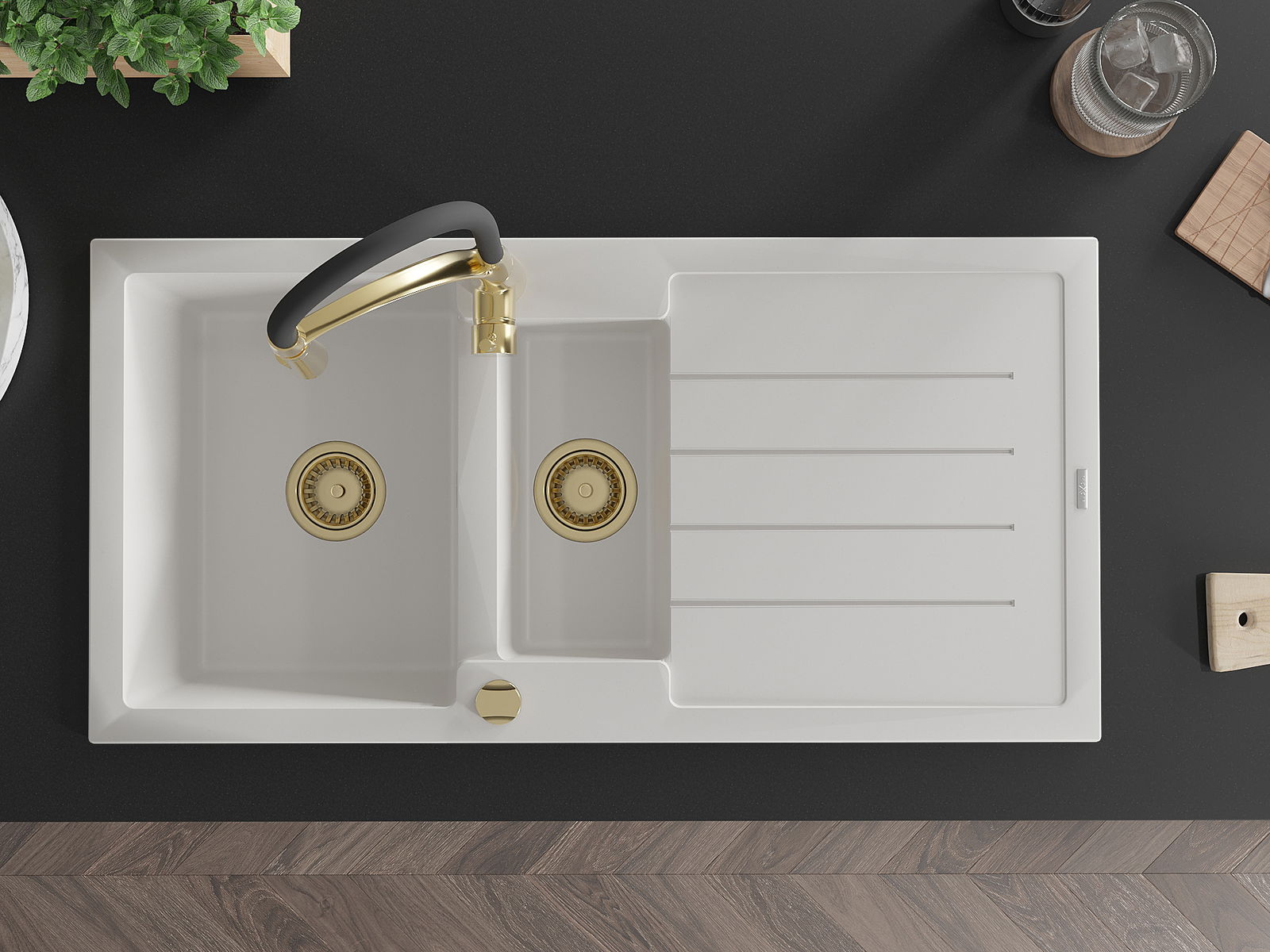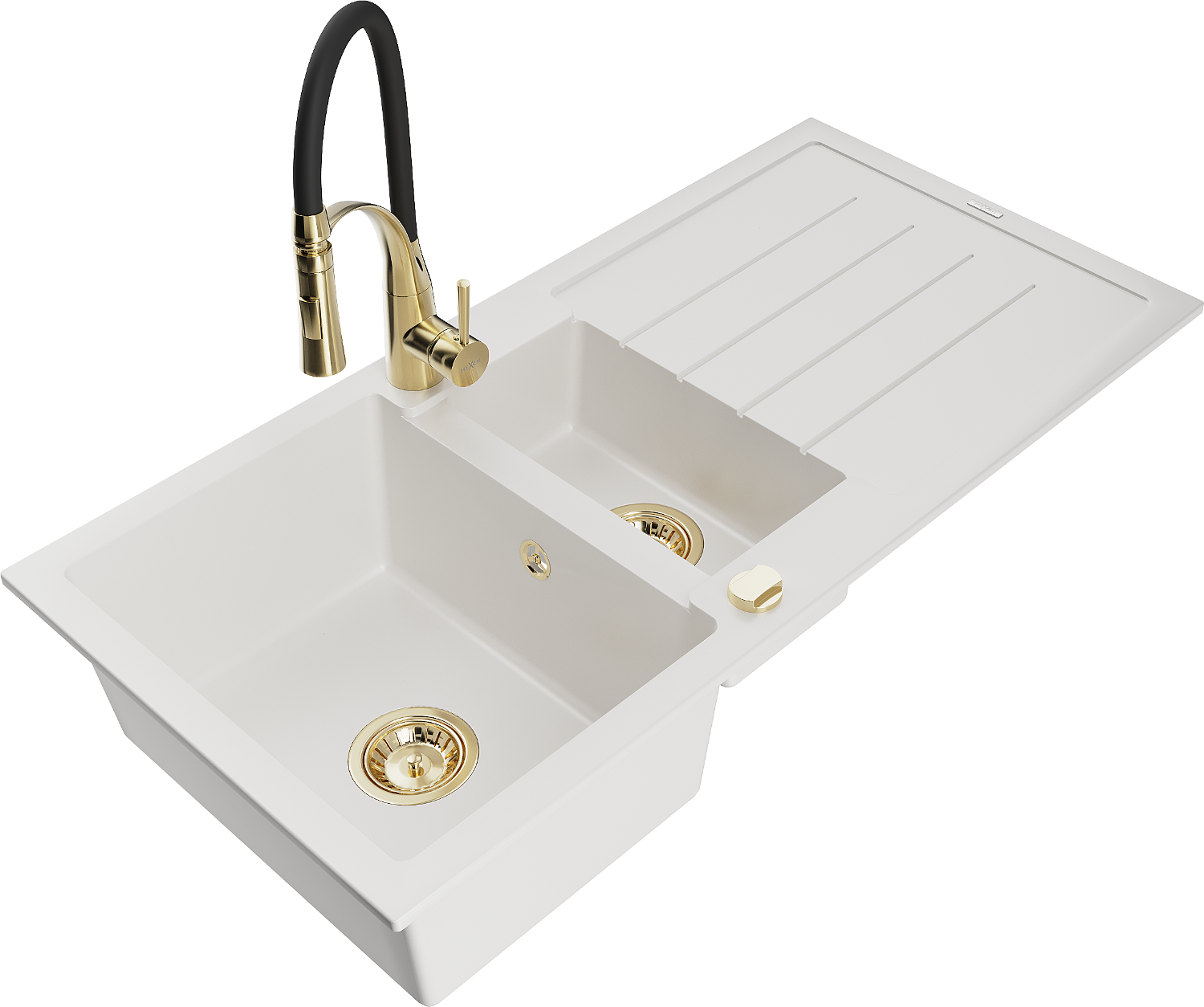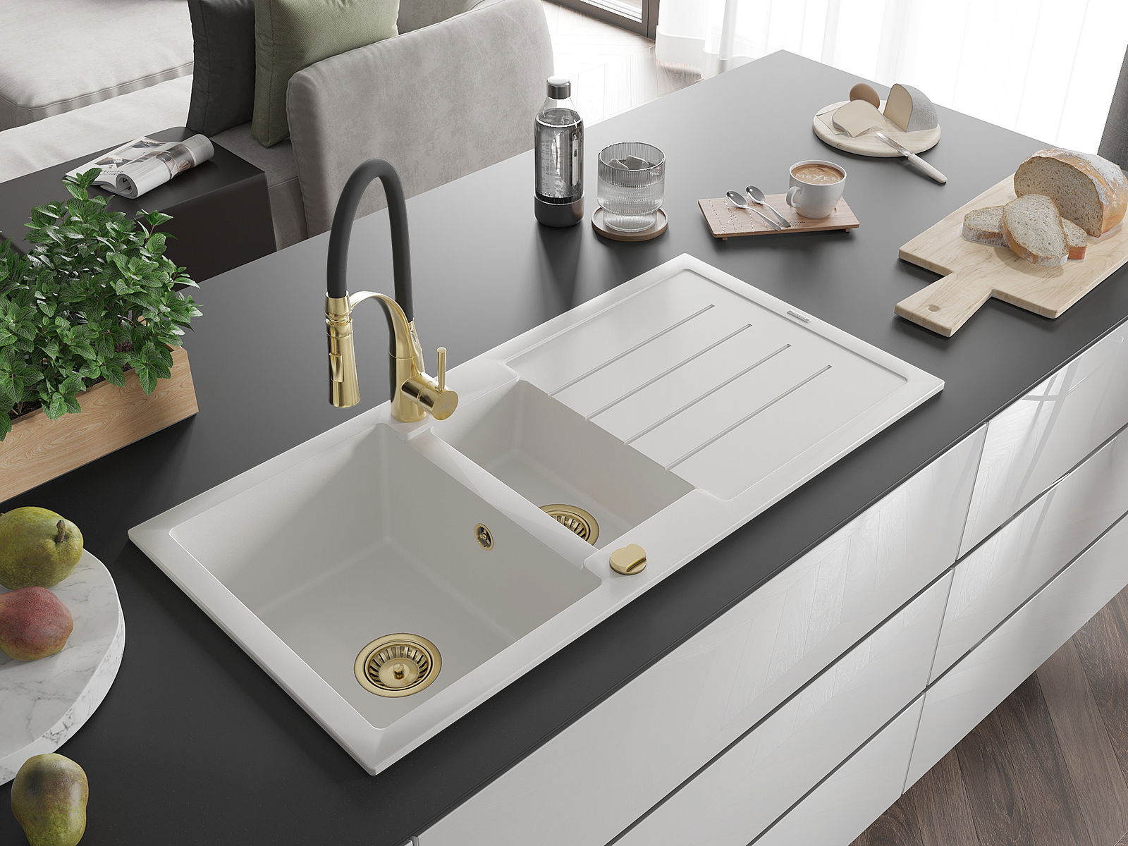 Mexen Andres lavello in granito a 1,5 vasca con gocciolatoio e rubinetto da cucina Aster, bianco - 6515-20-73450-57-G