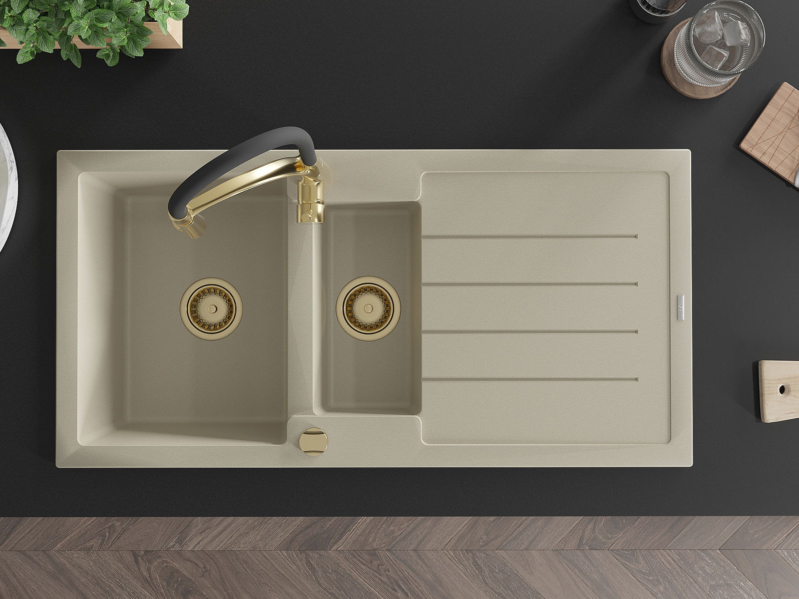 Mexen Andres lavello in granito 1,5 vasche con scolapiatti e rubinetto da cucina Aster, color beige - 6515-69-73450-57-G