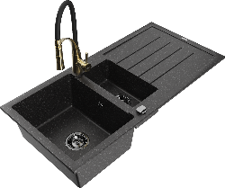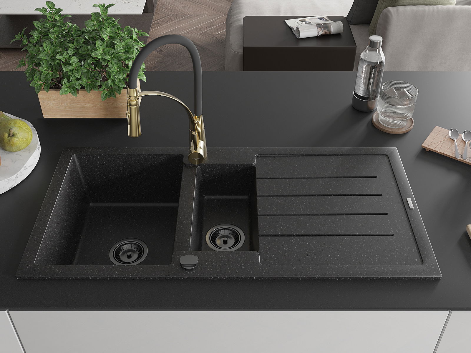 Mexen Andres lavello in granito 1,5 vasche con sgocciolatoio e rubinetto cucina Aster, nero/argento - 6515-73-73450-57-B
