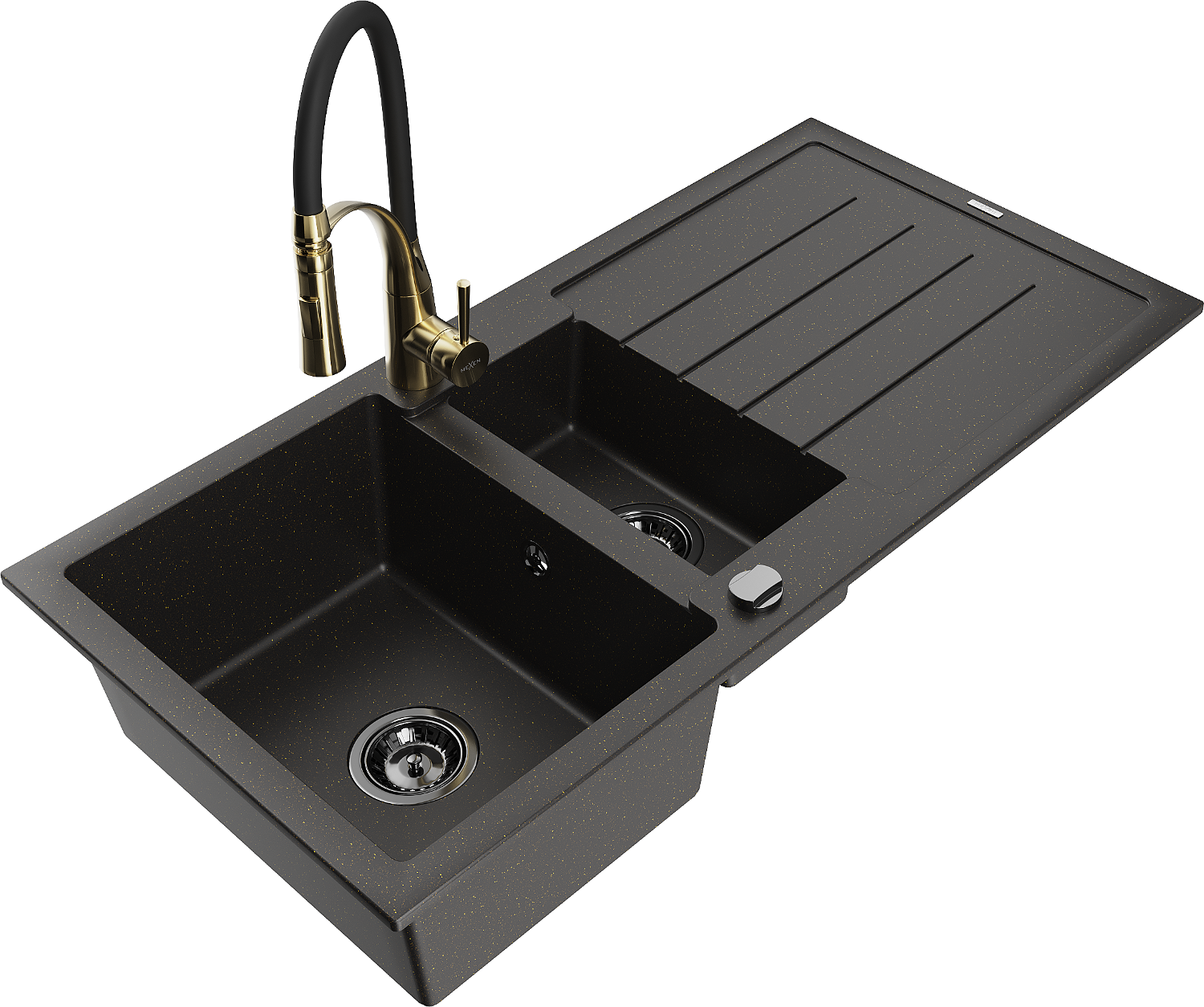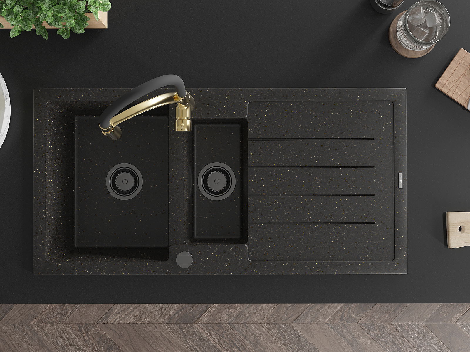 Mexen Andres lavello in granito 1,5 vasca con scolapiatti e rubinetto da cucina Aster, nero/oro metallico - 6515-75-73450-57-B