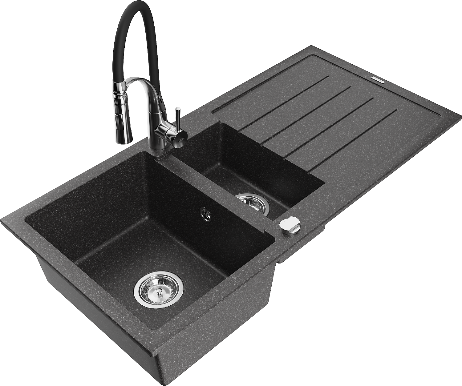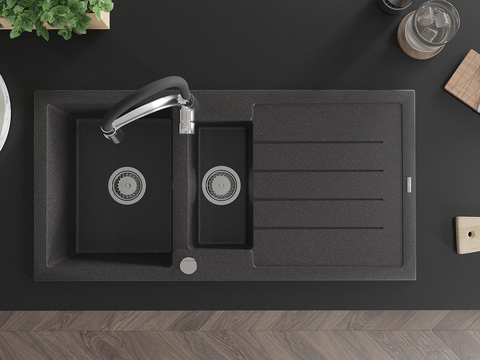 Mexen Andres lavello in granito 1,5 vasche con scolapiatti e miscelatore da cucina Aster, nero punteggiato - 6515-76-73450-07