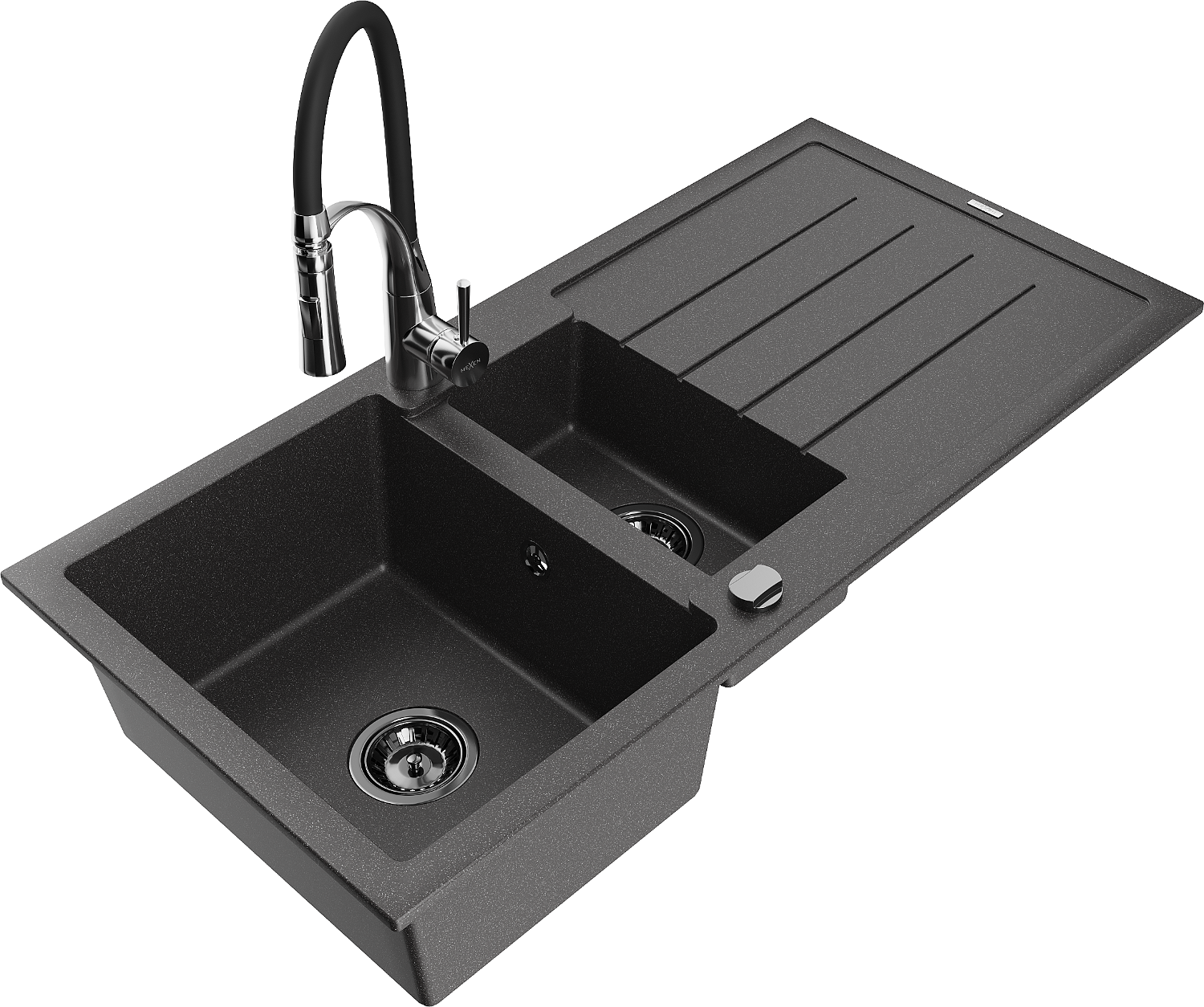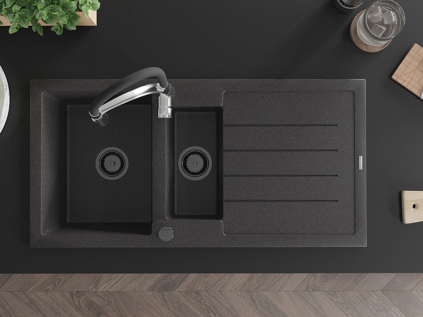 Mexen Andres lavello in granito 1,5 vasche con scolapiatti e rubinetto cucina Aster, nero punteggiato - 6515-76-73450-07-B