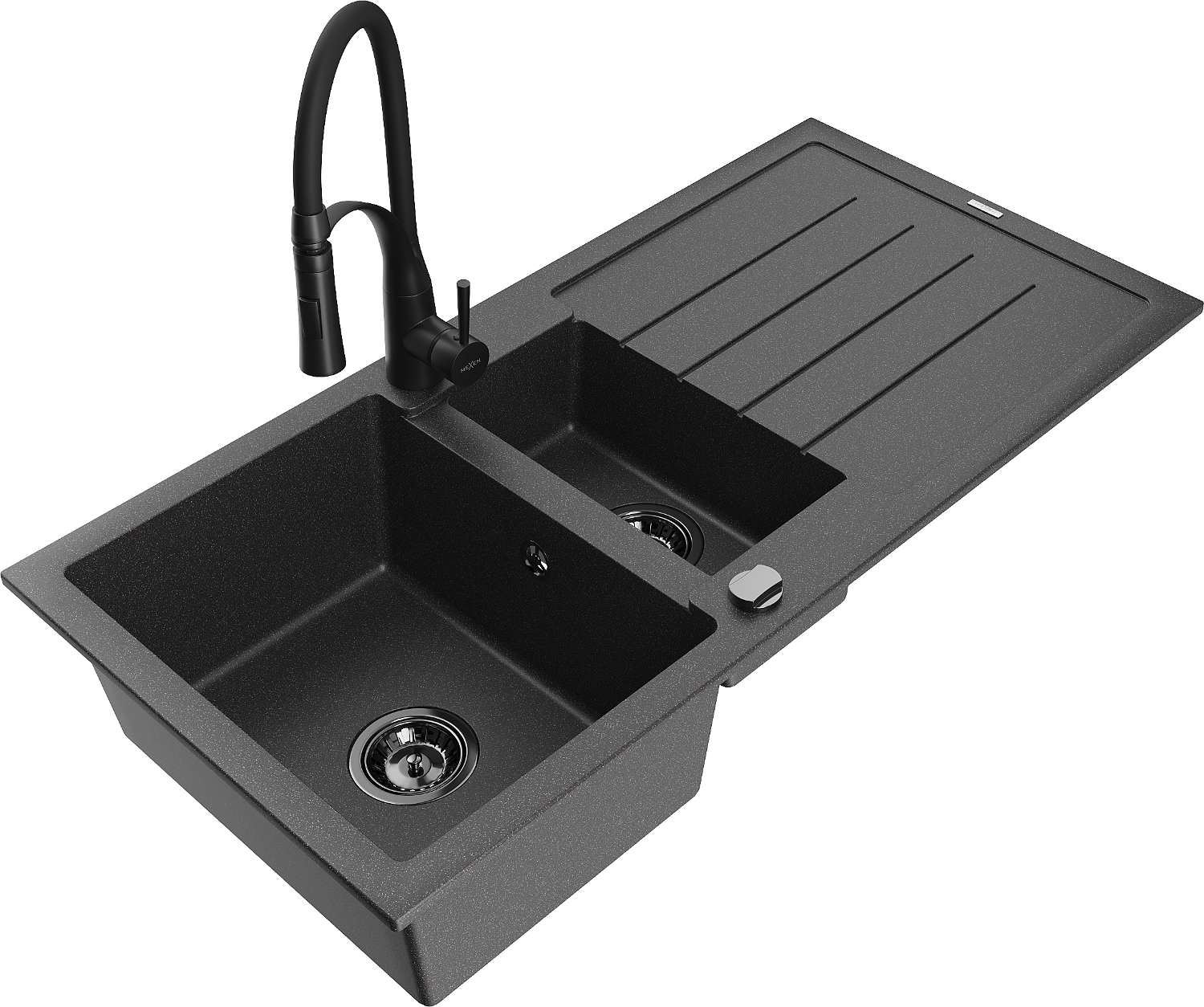 Mexen Andres lavello in granito 1,5 vasca con scolapiatti e rubinetto da cucina Aster, nero maculato - 6515-76-73450-70-B