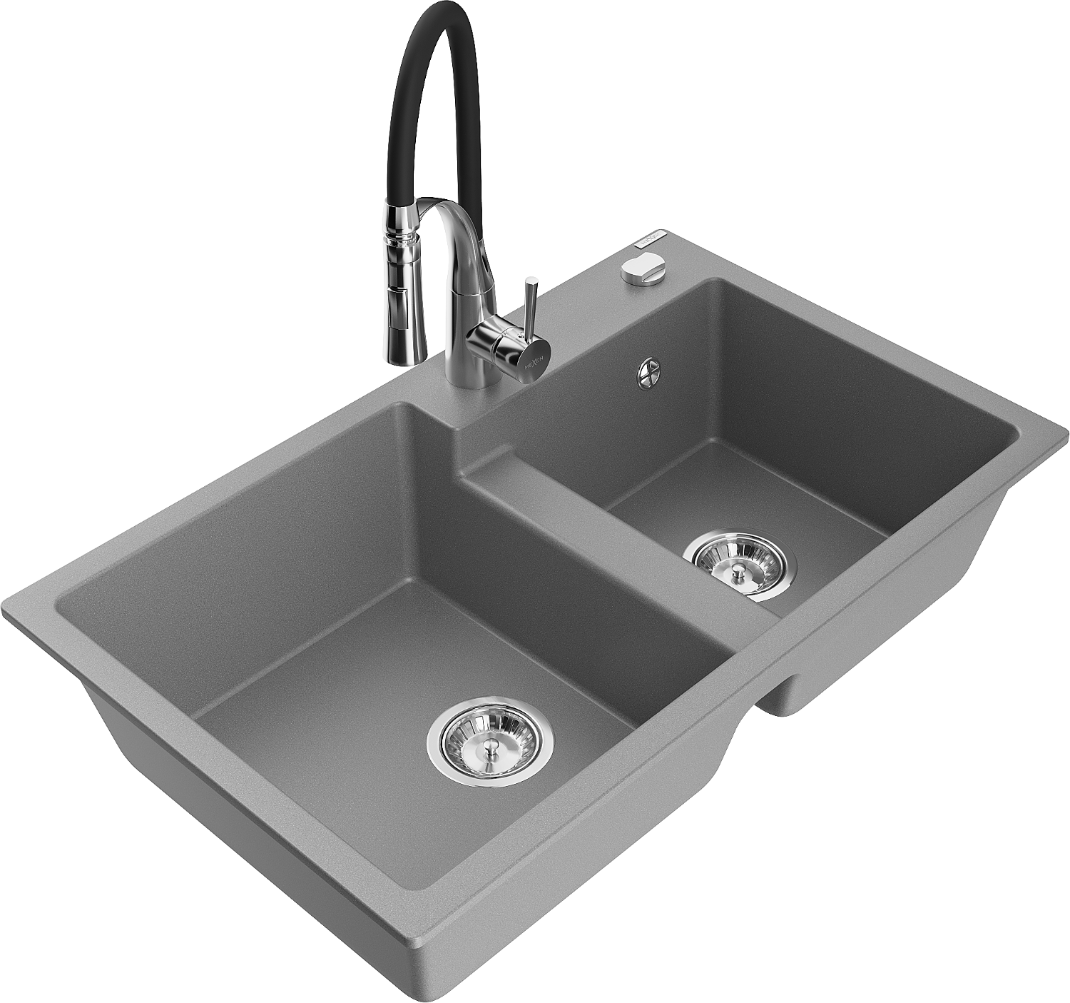Mexen Tomas lavello da cucina in granito a 2 vasche con miscelatore da cucina Aster, grigio - 6516-71-73450-07