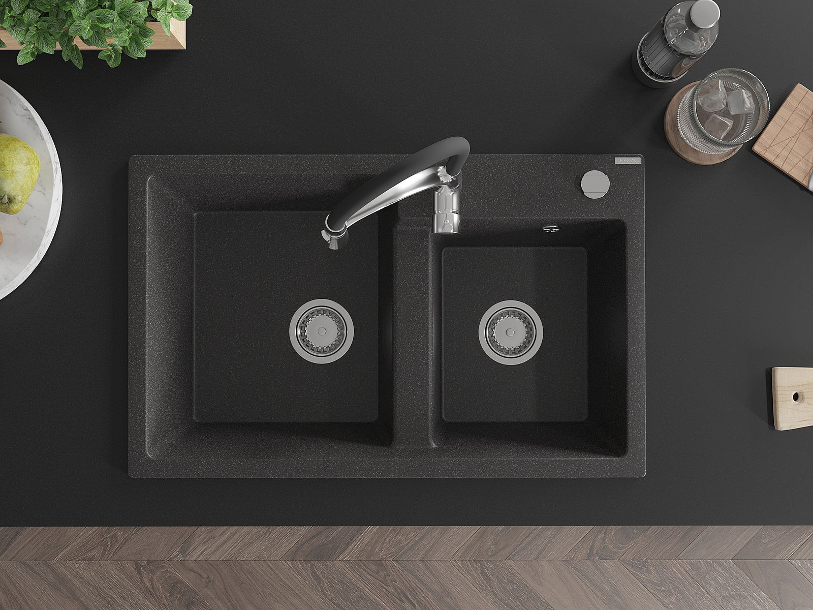 Il lavello ha un foro fresato di 35 mm di diametro da sfondare autonomamente. Può essere utilizzato, tra l'altro, per montare un dosatore di liquidi, che eliminerà la presenza di bottiglie di plastica in cucina e conferirà un tocco di eleganza.