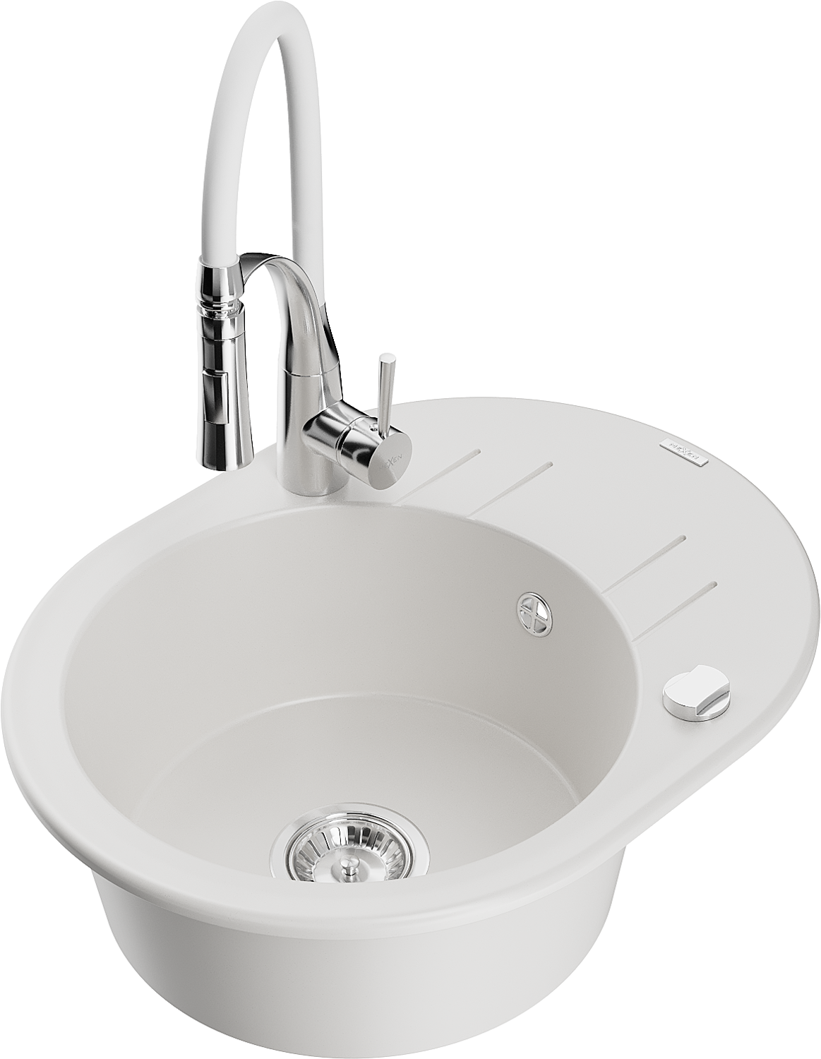 Mexen Kevin lavello in granito a 1 vasca con sgocciolatoio e rubinetto da cucina Aster, bianco - 6517-20-73450-02