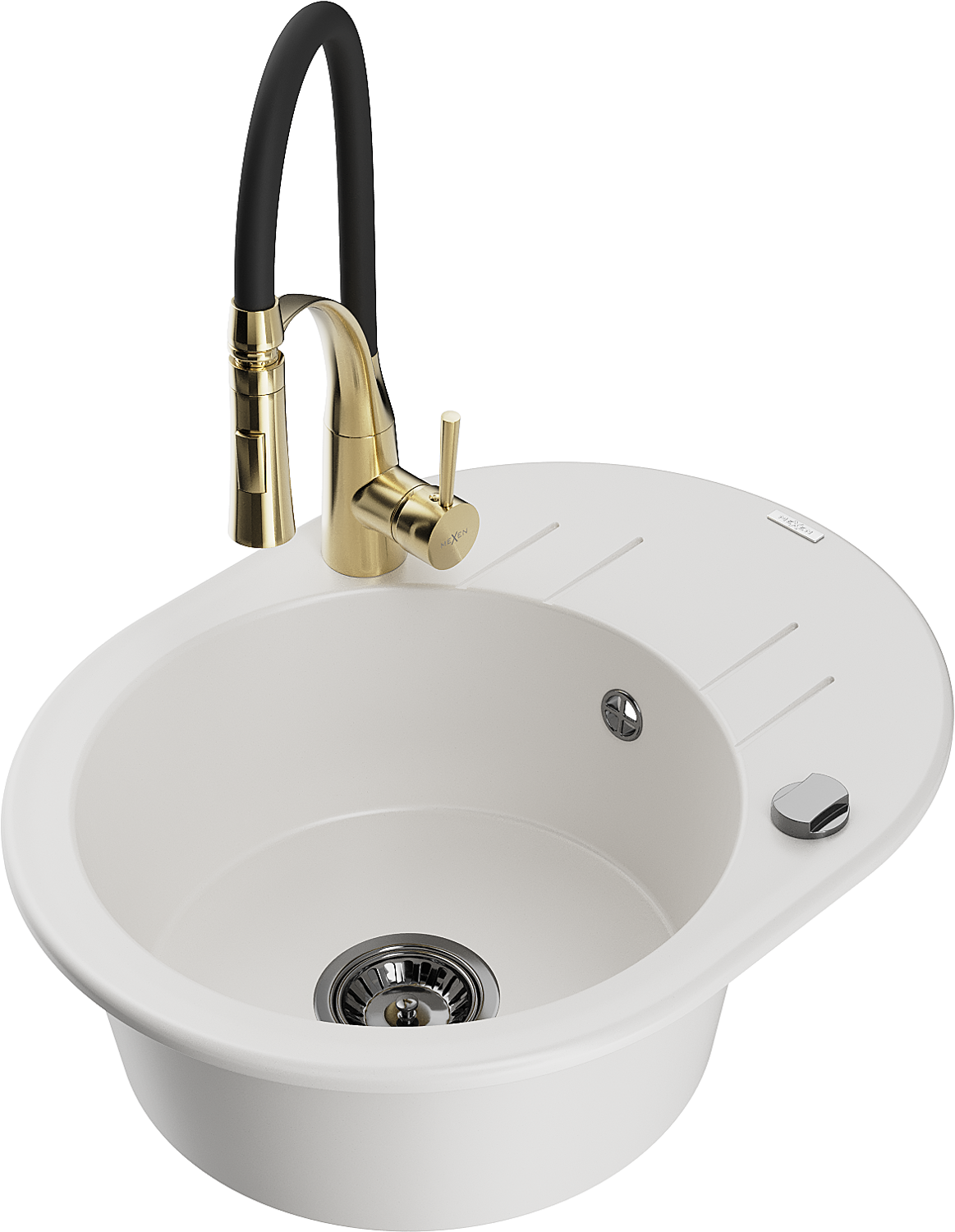 Mexen Kevin lavello in granito a 1 vasca con sgocciolatoio e rubinetto da cucina Aster, bianco - 6517-20-73450-57-B