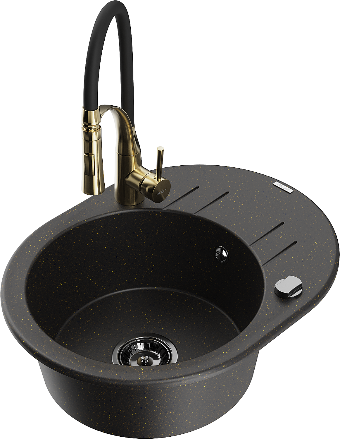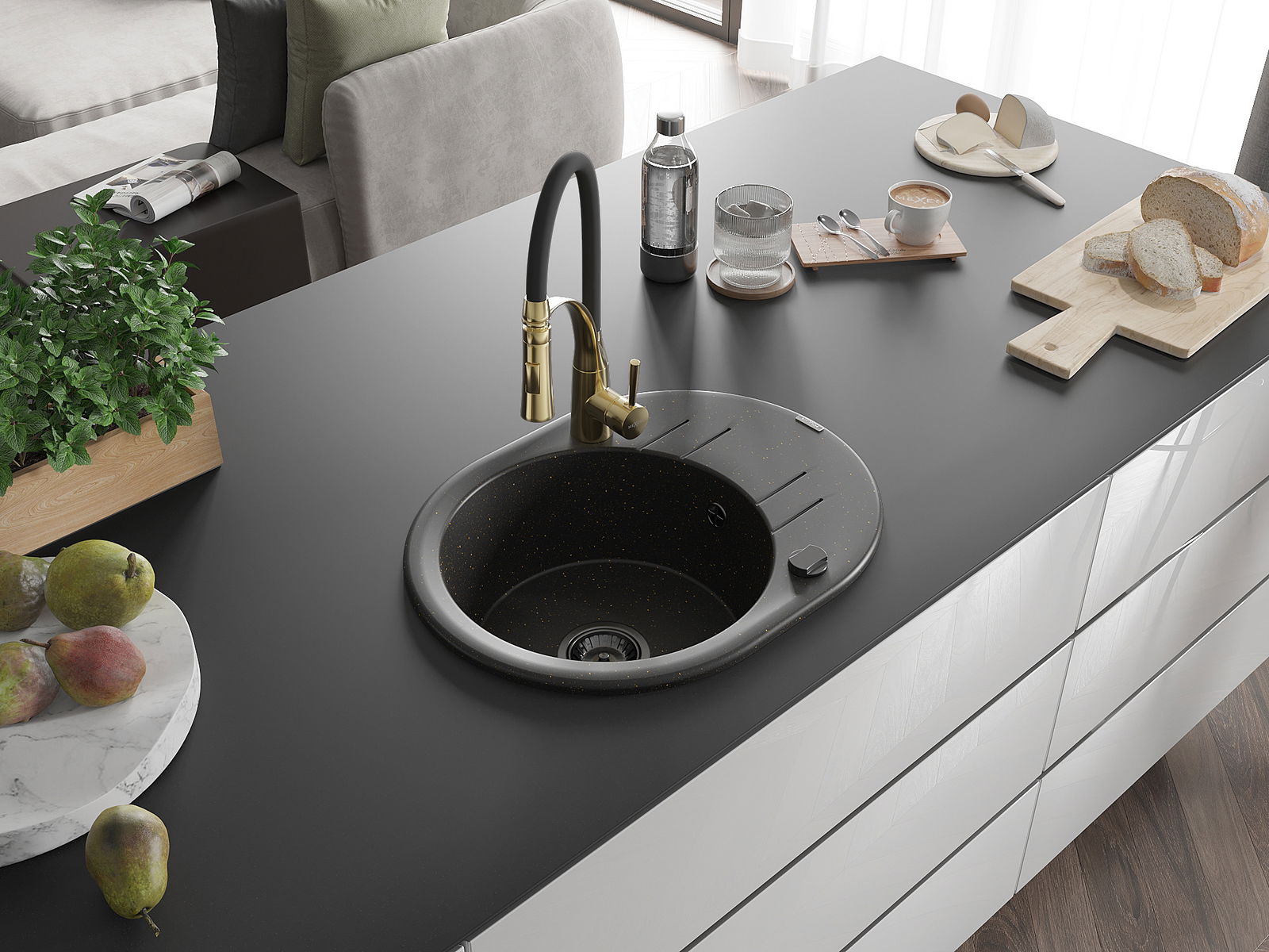 Mexen Kevin lavello in granito a 1 vasca con scolapiatti e rubinetto da cucina Aster, nero/oro metallizzato - 6517-75-73450-57-B