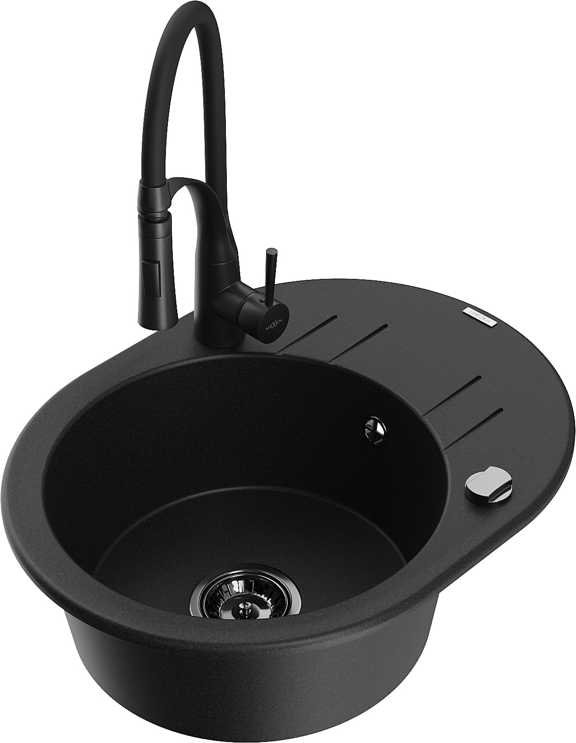 Mexen Kevin lavello da cucina in granito con 1 vasca e sgocciolatoio e rubinetto da cucina Aster, nero - 6517-77-73450-70-B