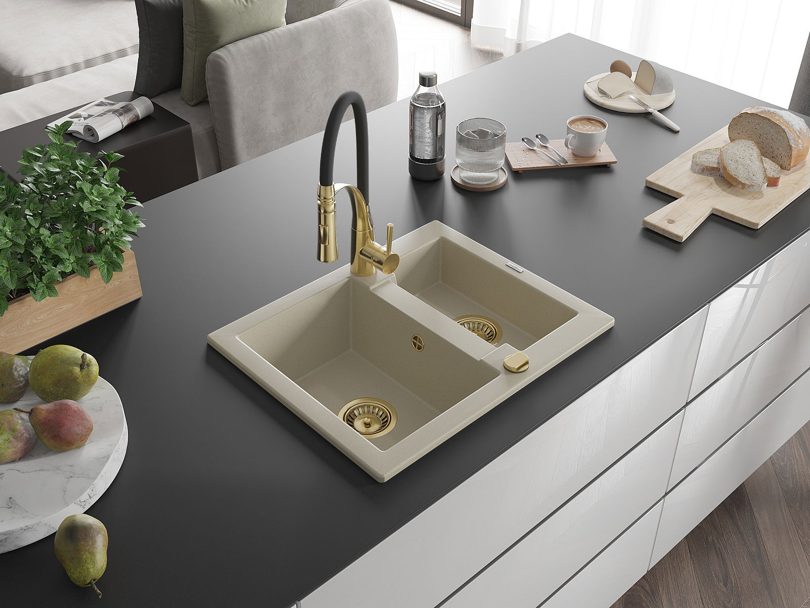 Il lavello è realizzato in granito di alta qualità. Rappresenta un complemento elegante e, soprattutto, pratico per ogni cucina, indipendentemente dal suo stile. L'alta qualità e la durata del granito garantiscono un utilizzo che dura per molti anni.