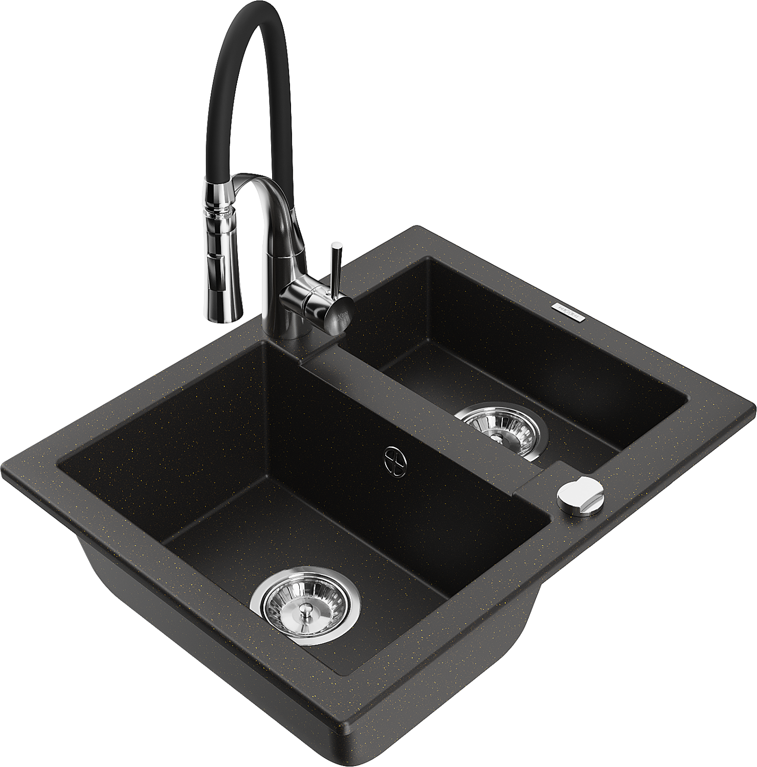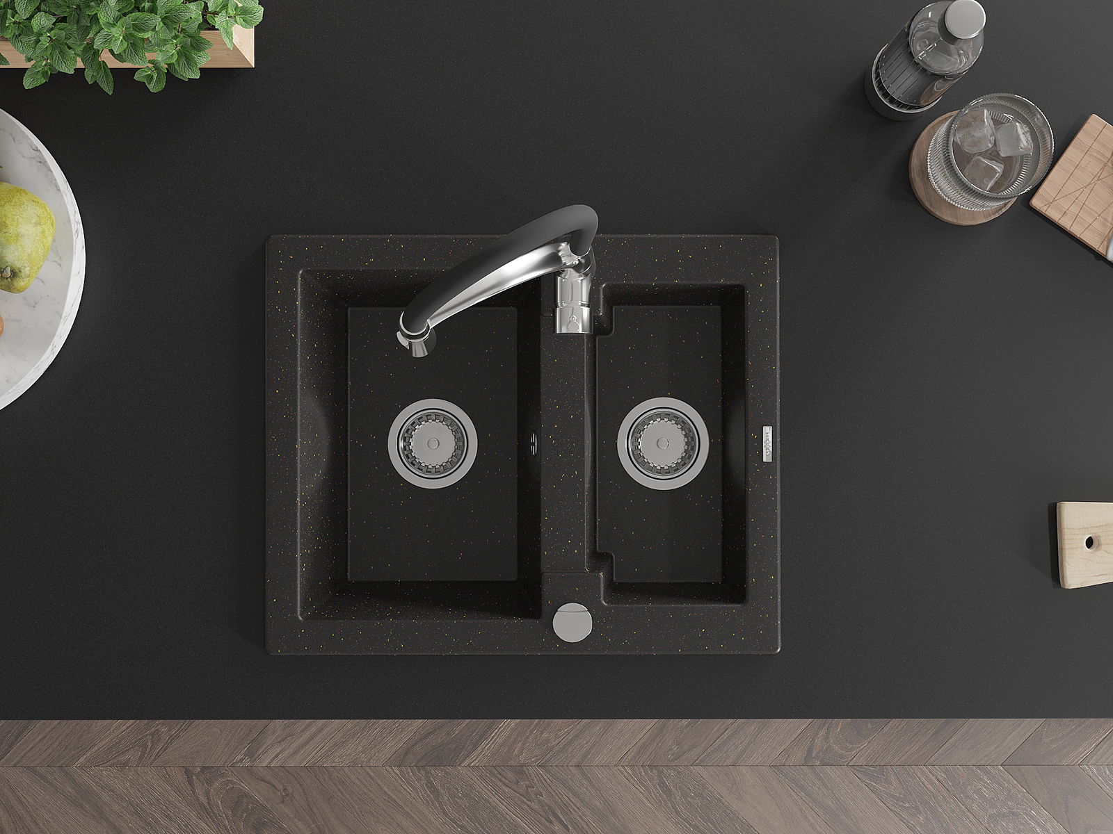 Mexen Carlos lavello in granito a 1,5 vasca con rubinetto da cucina Aster, nero/oro metallico - 6518-75-73450-07