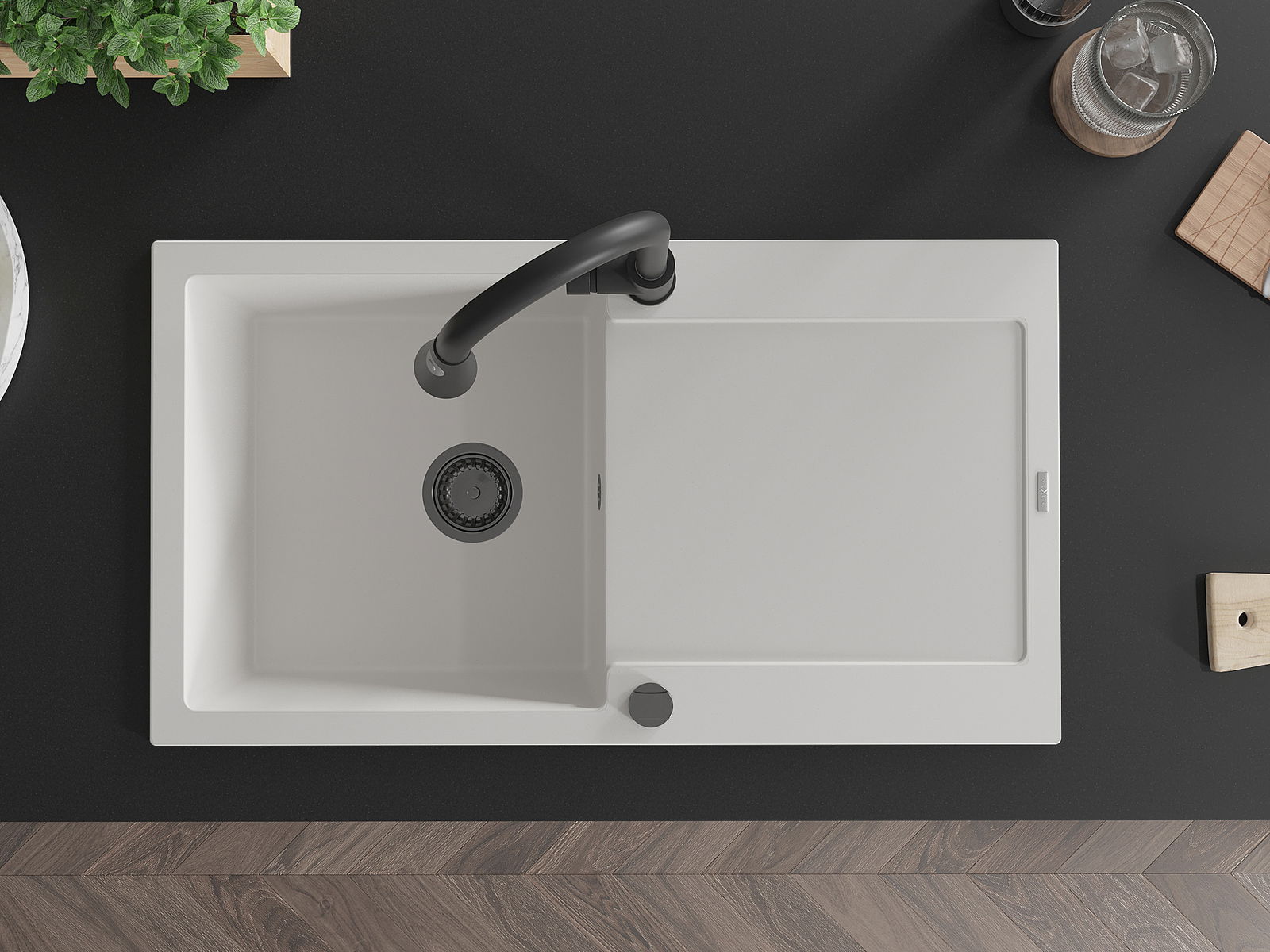 Mexen Leo lavello in granito a 1 vasca con sgocciolatoio e rubinetto da cucina Elia, bianco - 6501-20-670101-70