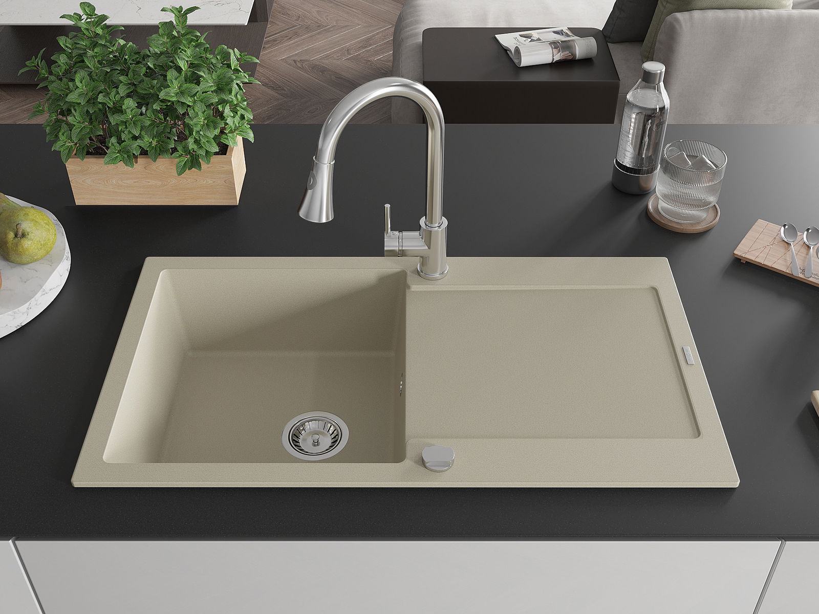 Il lavello è realizzato in granito di alta qualità. Rappresenta un complemento elegante e, soprattutto, pratico per ogni cucina, indipendentemente dal suo stile. L'alta qualità e la durata del granito garantiscono un utilizzo che dura per molti anni.