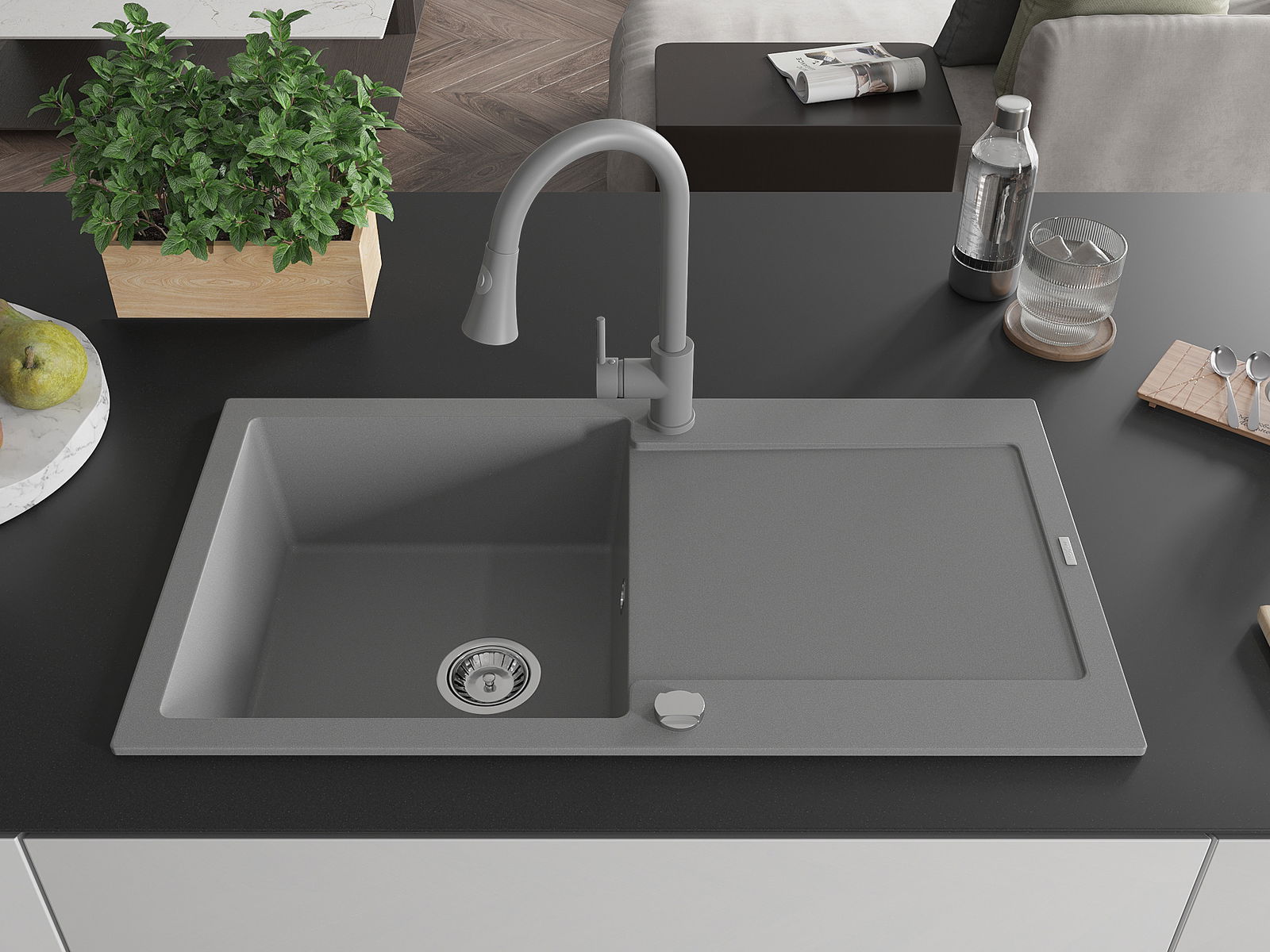 Mexen Leo lavello in granito a 1 vasca con sgocciolatoio e rubinetto da cucina Elia, grigio - 6501-71-670101-71