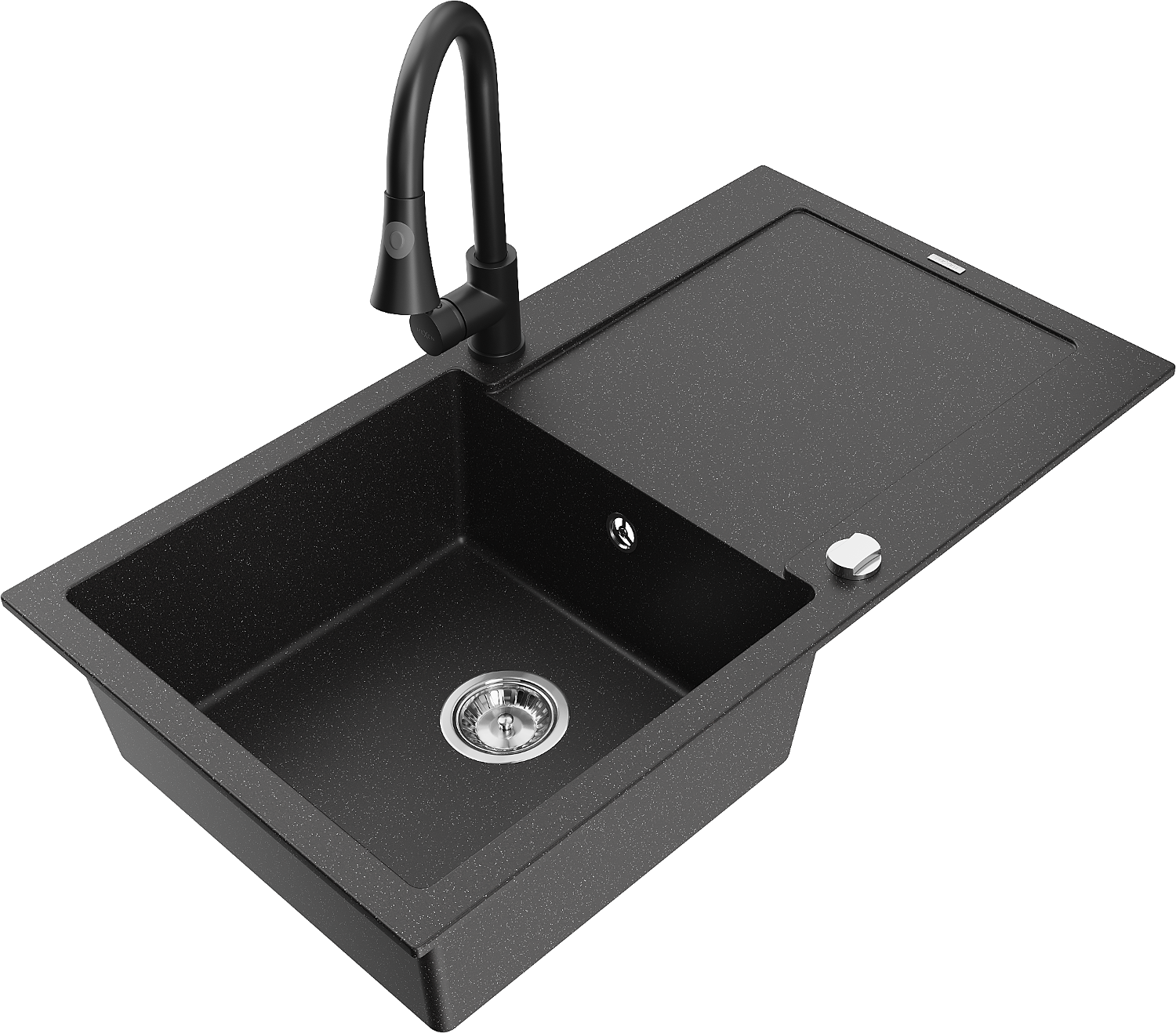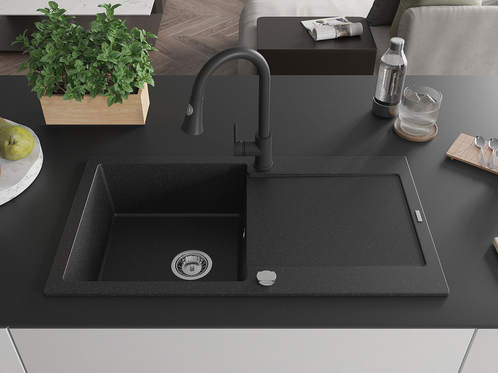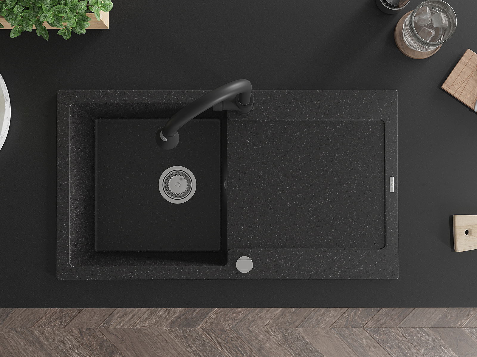 Mexen Leo lavello in granito a 1 vasca con scolapiatti e rubinetto da cucina Elia, nero/metallico argento - 6501-73-670101-70