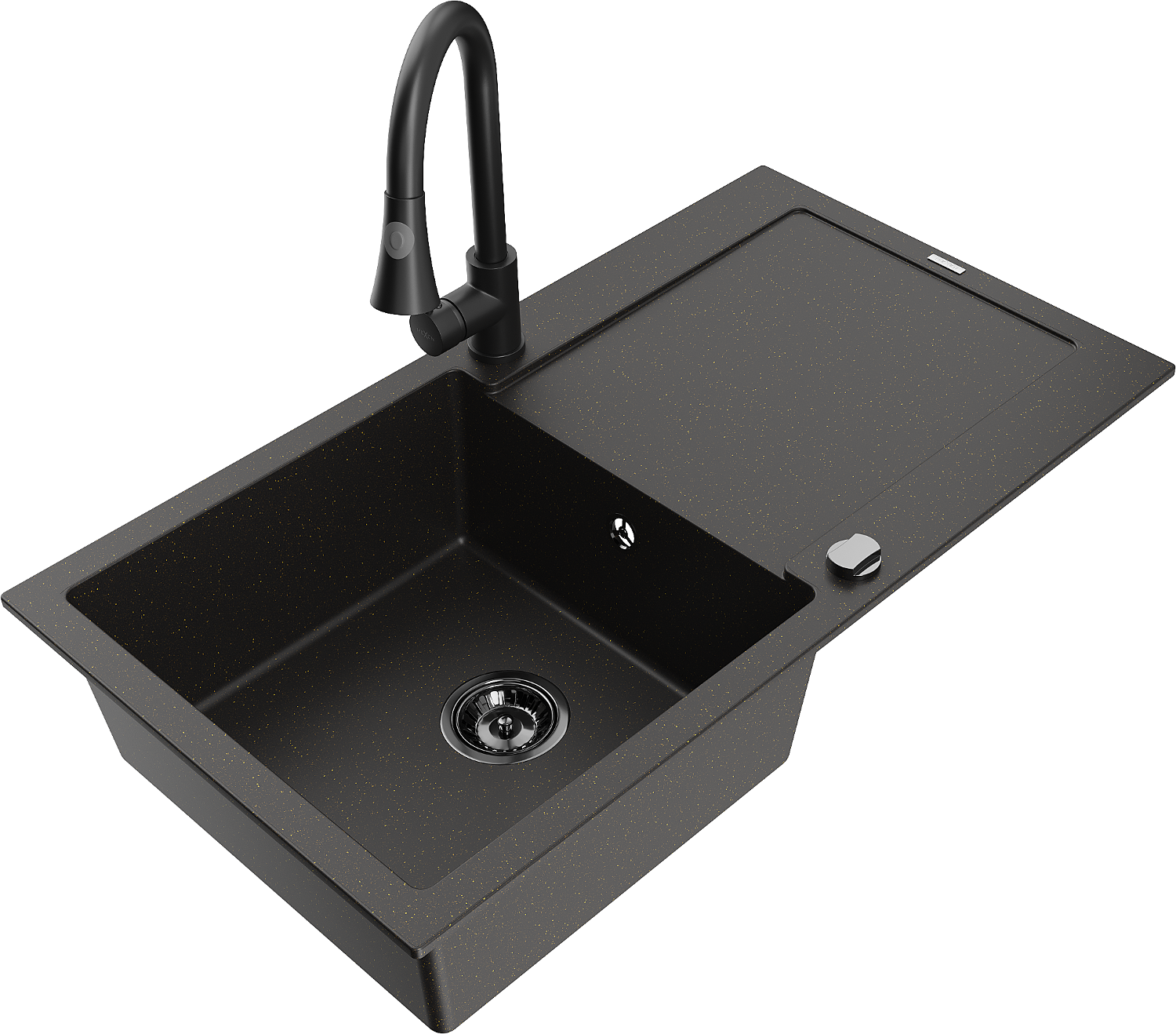 Mexen Leo lavello in granito a una vasca con scolapiatti e miscelatore da cucina Elia, nero/oro metallico - 6501-75-670101-70-B