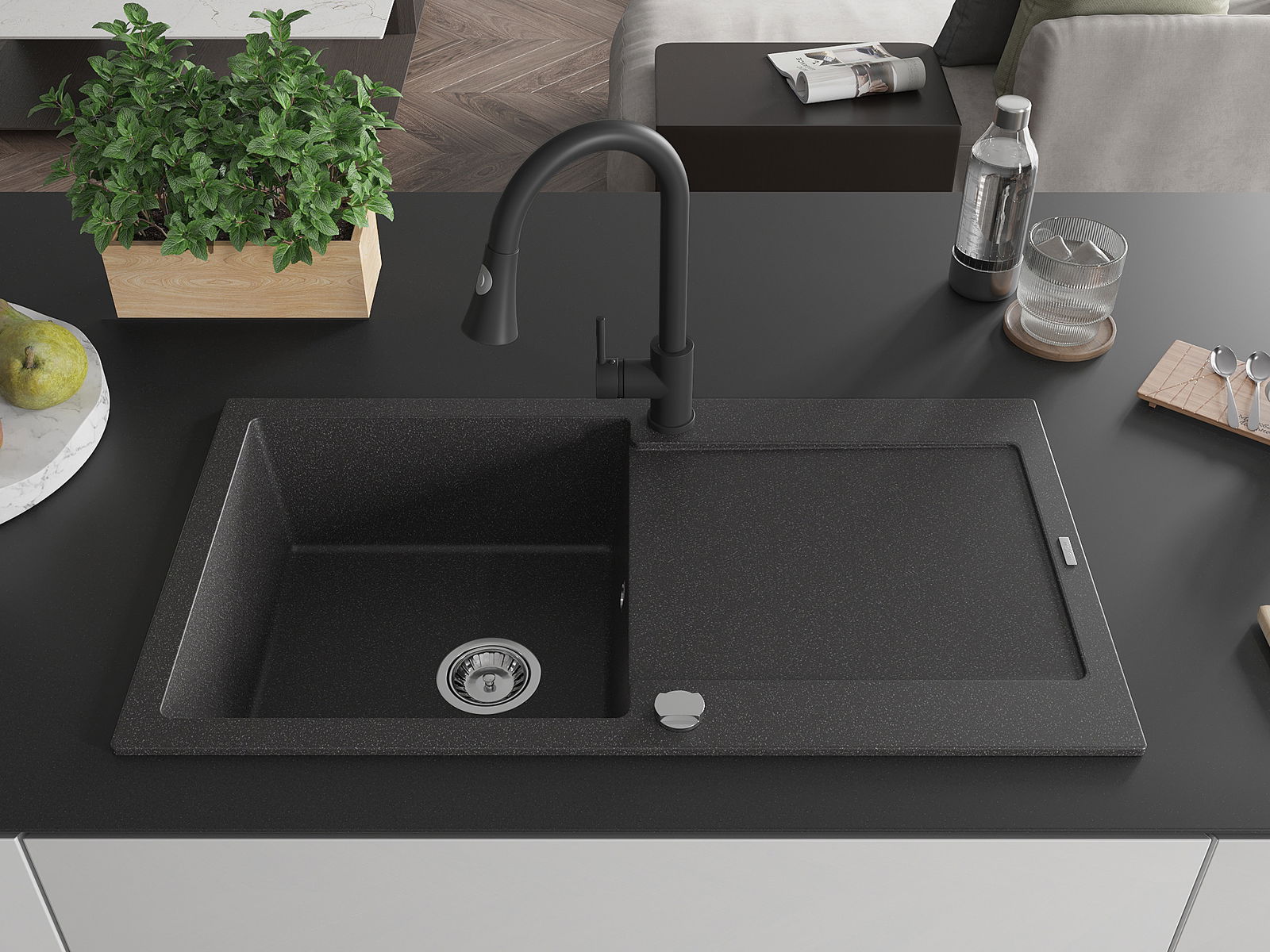 Il lavello è realizzato in granito di alta qualità. Rappresenta un complemento elegante e, soprattutto, pratico per ogni cucina, indipendentemente dal suo stile. L'alta qualità e la durata del granito garantiscono un utilizzo che dura per molti anni.