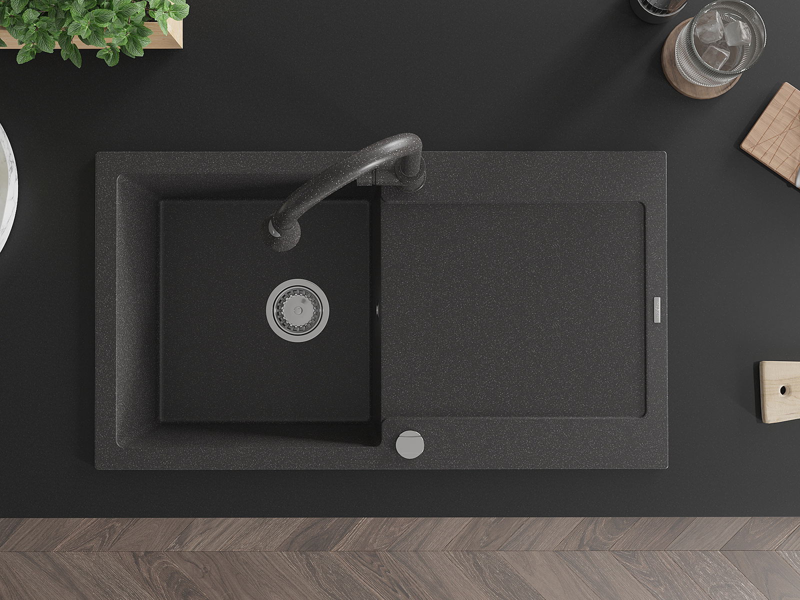 Mexen Leo lavello in granito a 1 vasca con sgocciolatoio e miscelatore da cucina Elia, nero maculato - 6501-76-670101-76