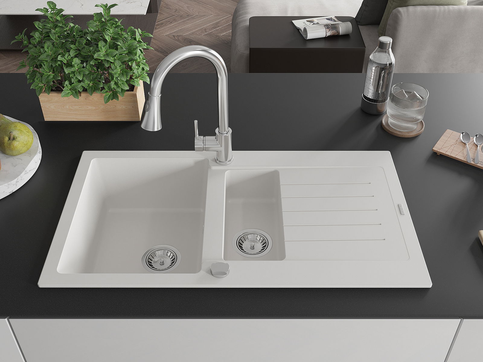 Mexen Matias lavello in granito 1,5 vasche con scolapiatti e rubinetto da cucina Elia, bianco - 6502-20-670101-00