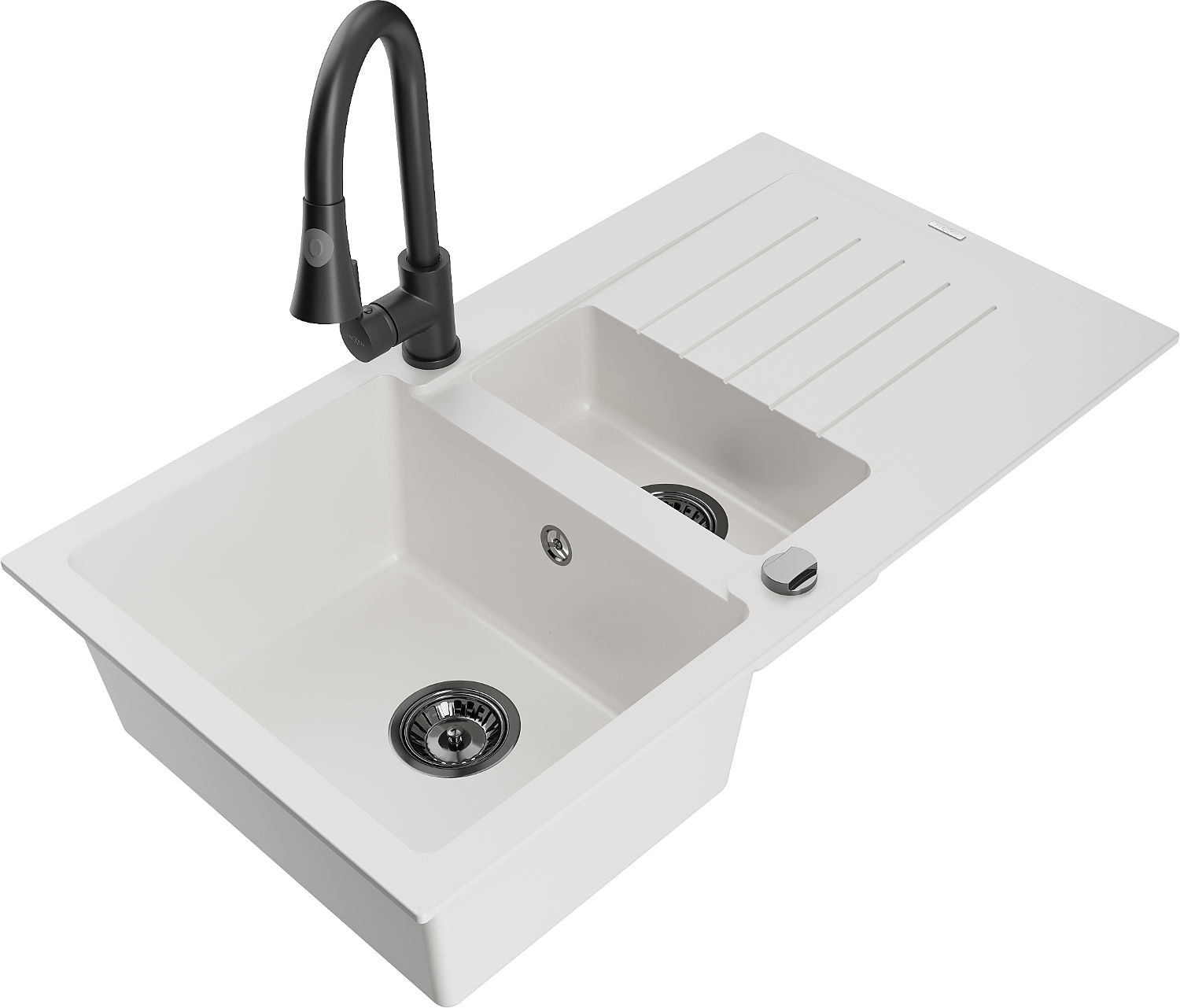 Mexen Matias lavello in granito 1,5 vasche con gocciolatoio e rubinetto da cucina Elia, bianco - 6502-20-670101-70