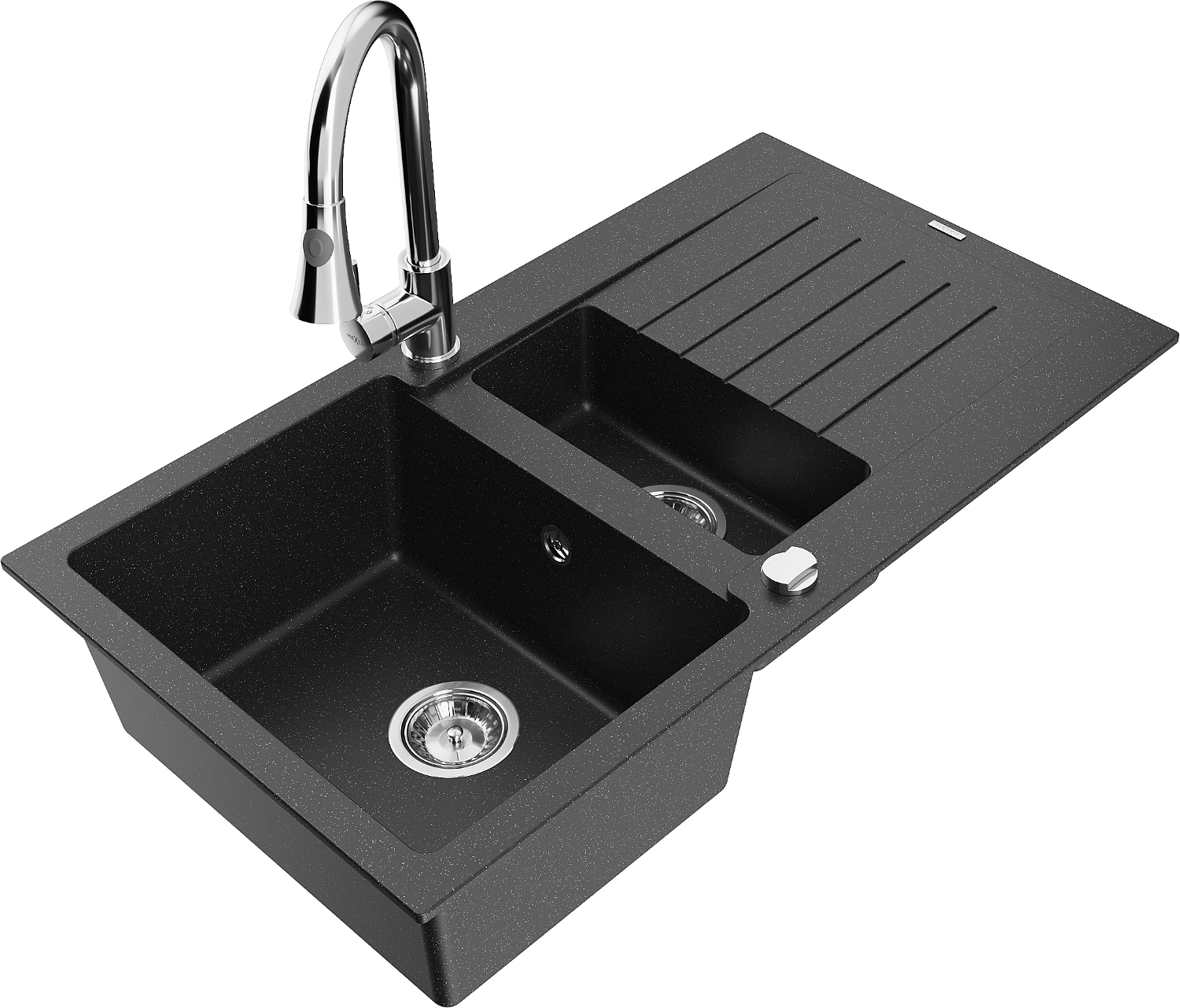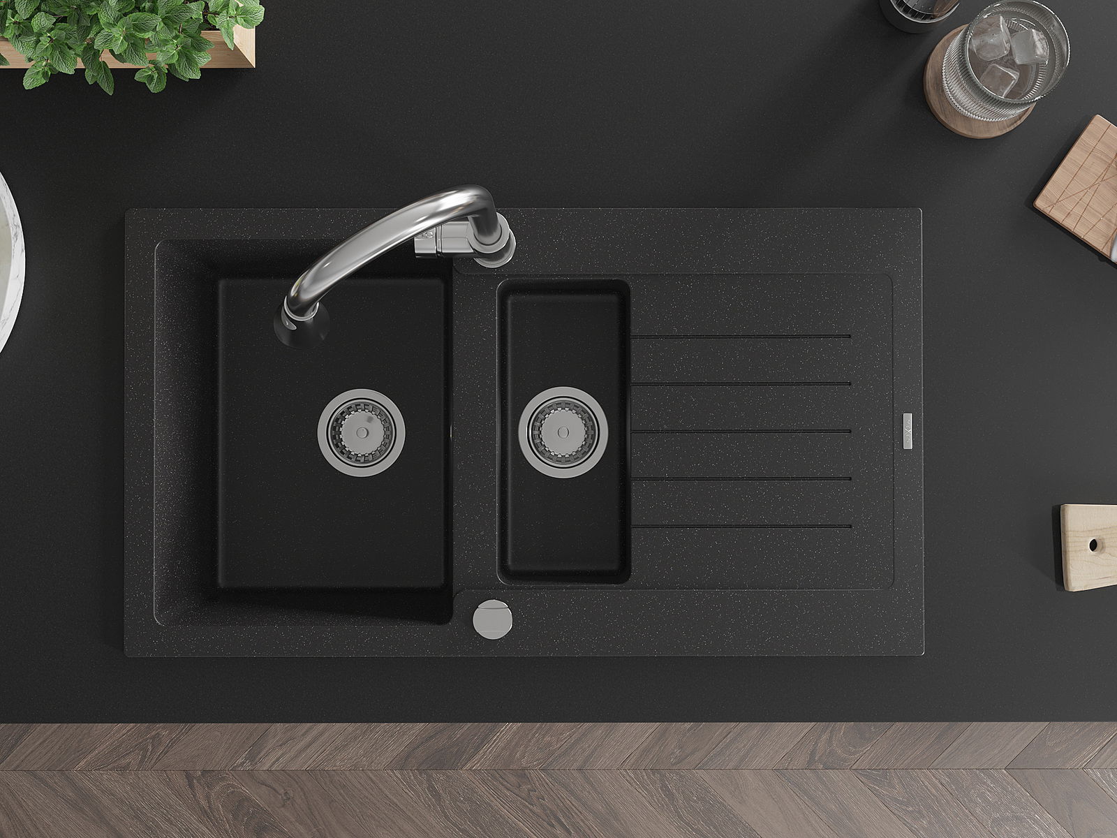 Mexen Matias lavello in granito 1,5 vasca con sgocciolatoio e rubinetto da cucina Elia, nero/metallo argento - 6502-73-670101-00