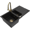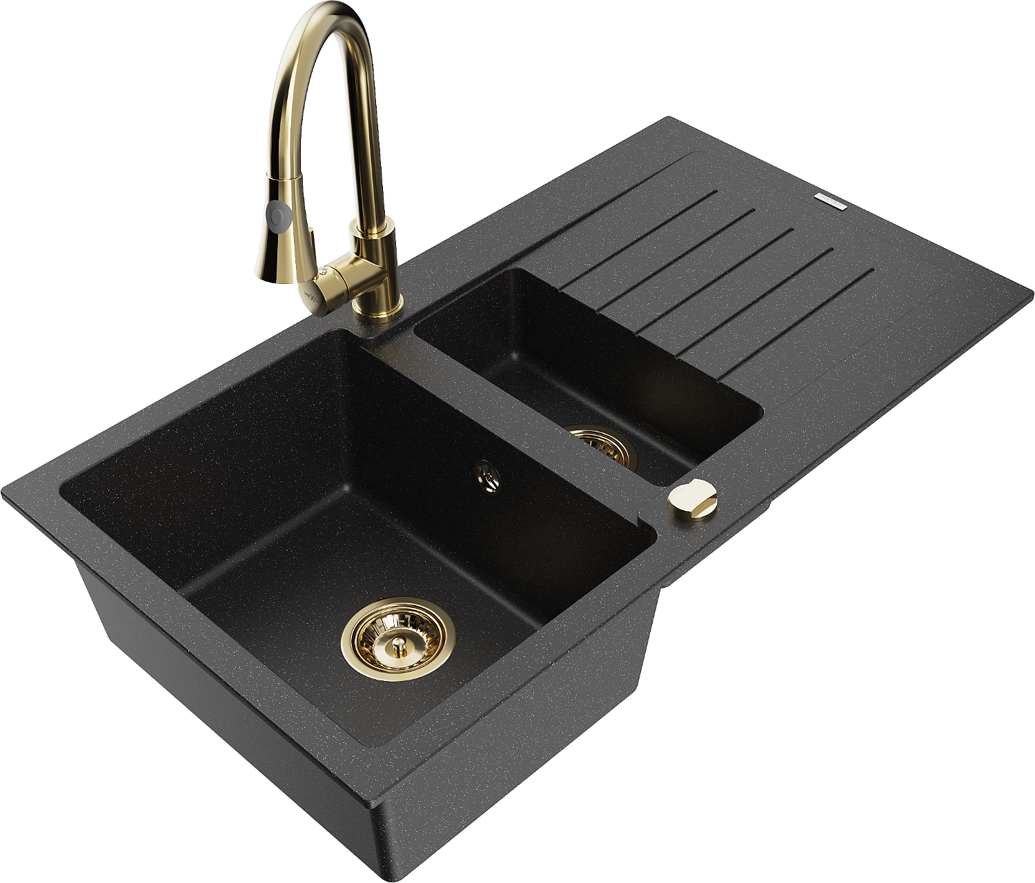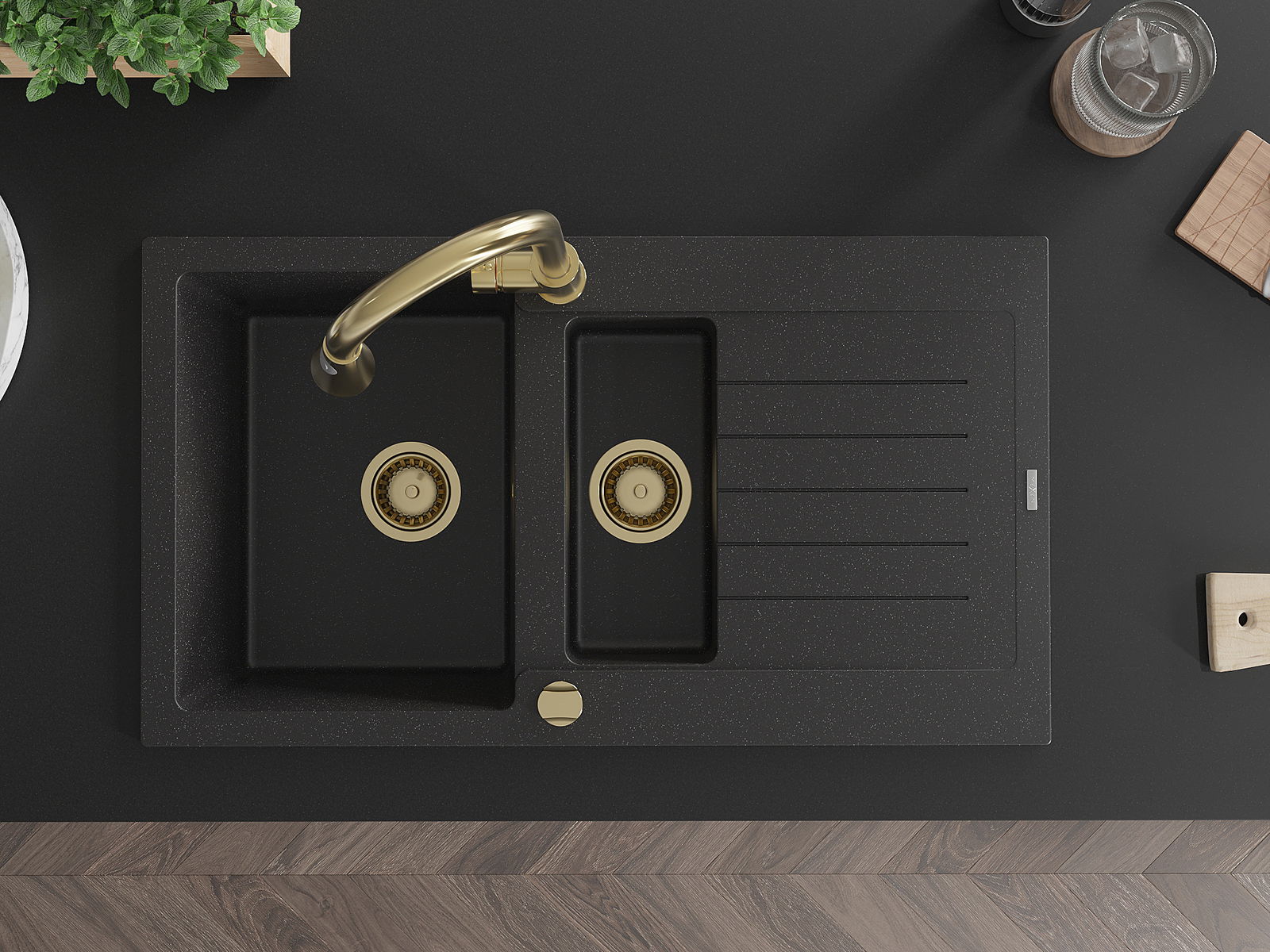 Mexen Matias lavello in granito 1,5 vasche con gocciolatoio e rubinetto da cucina Elia, nero/metallico argento