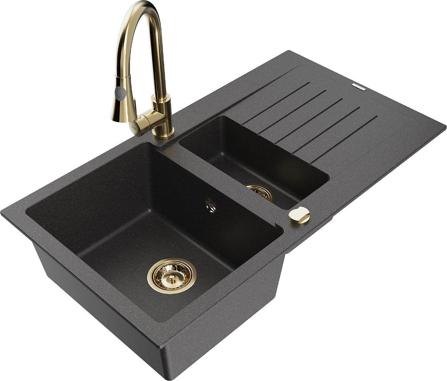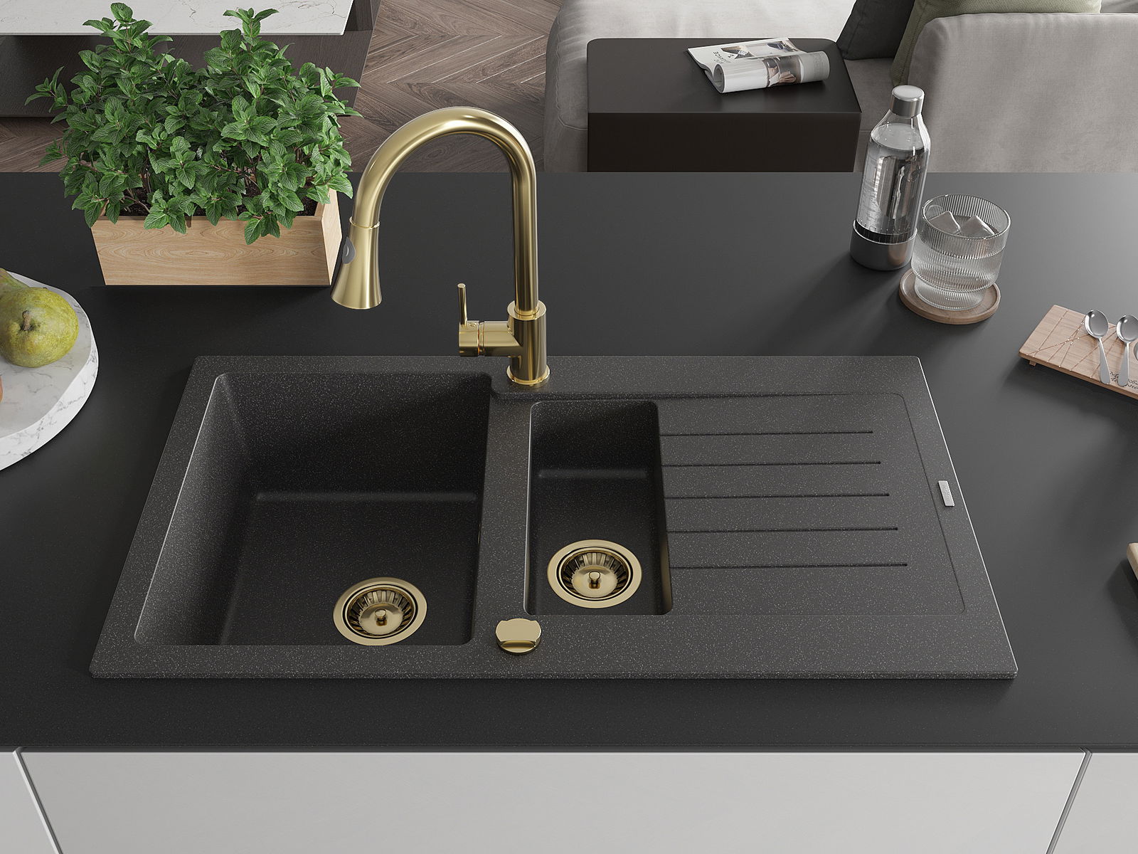 Mexen Matias lavello in granito 1,5 vasca con sgocciolatoio e rubinetto da cucina Elia, nero puntinato - 6502-76-670101-50