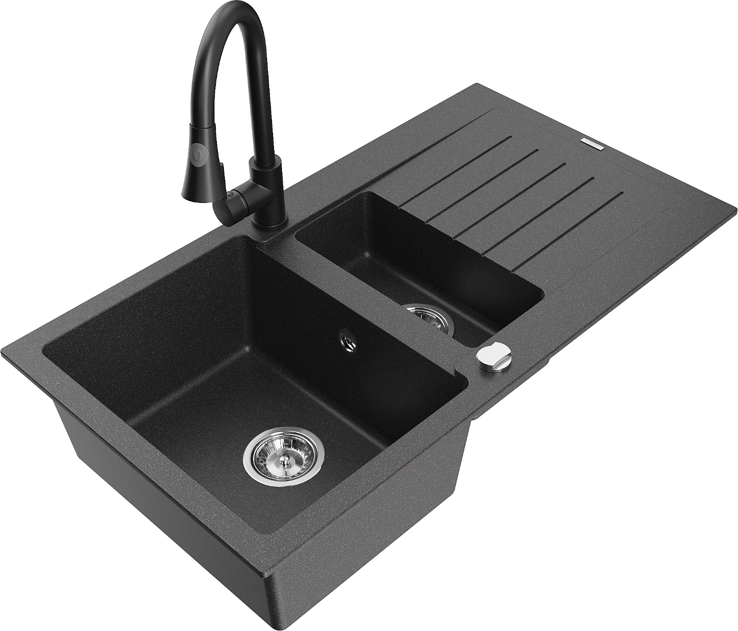 Mexen Matias lavello in granito 1,5 vasche con scolapiatti e rubinetto da cucina Elia, nero maculato - 6502-76-670101-70