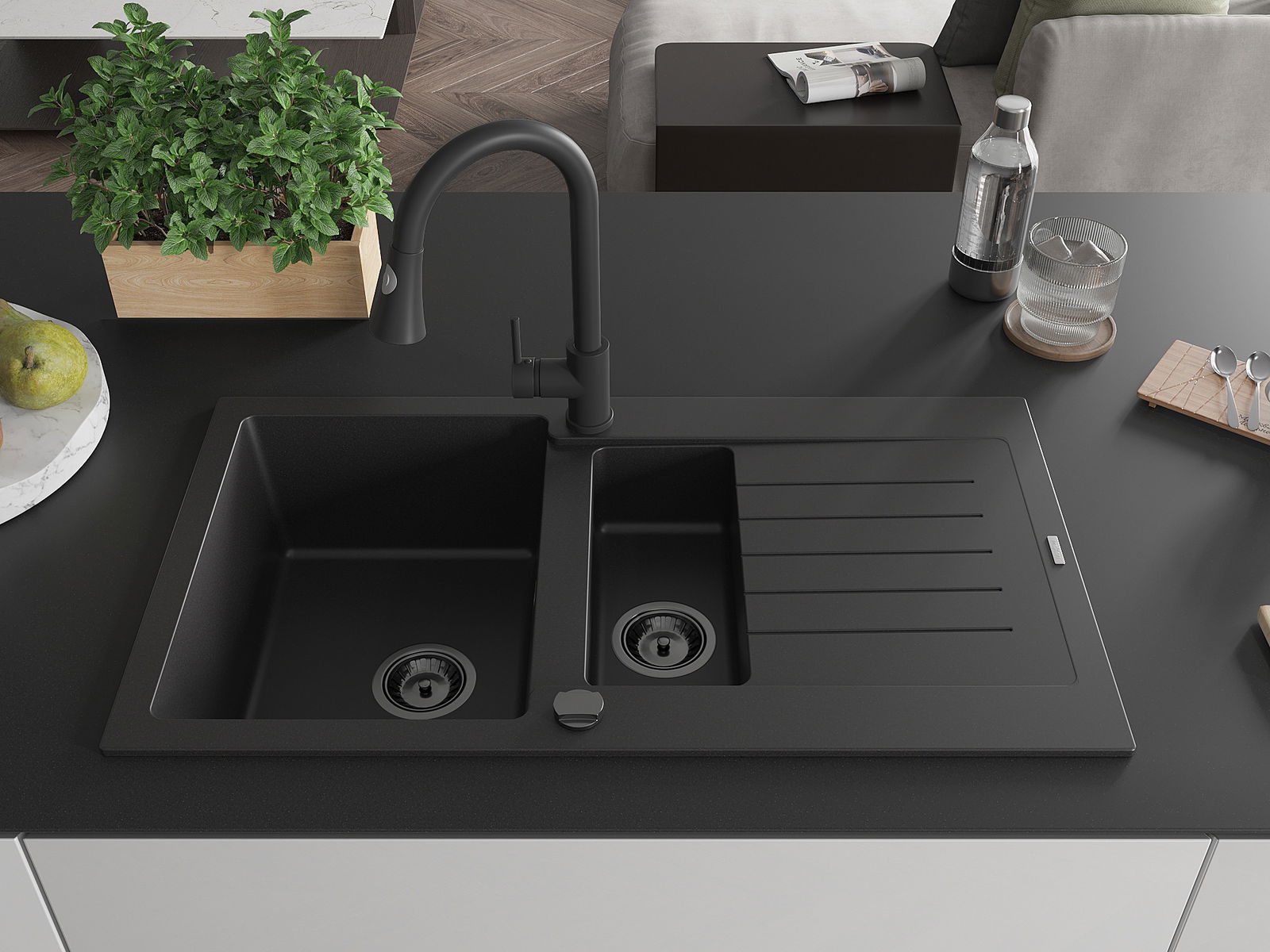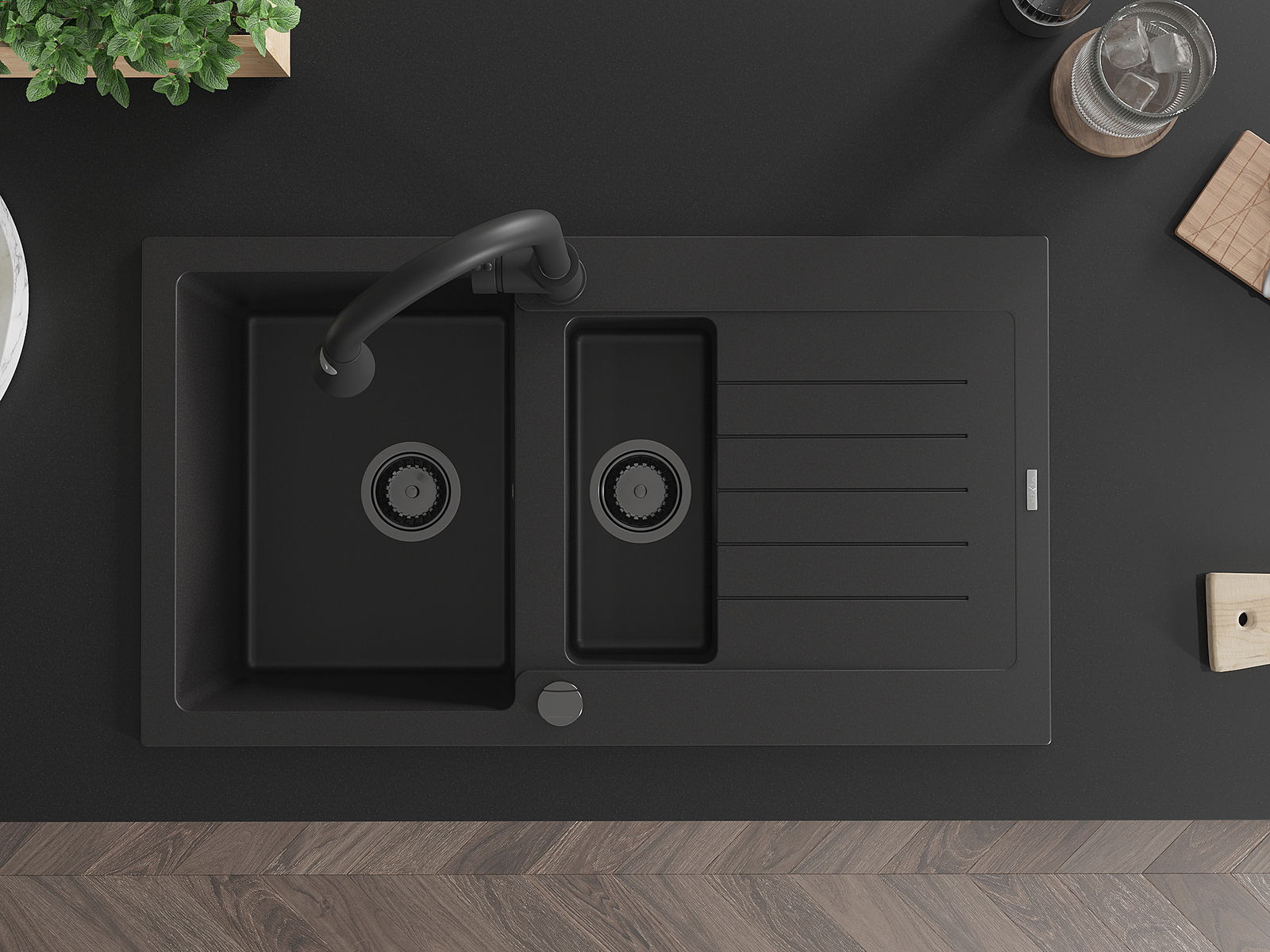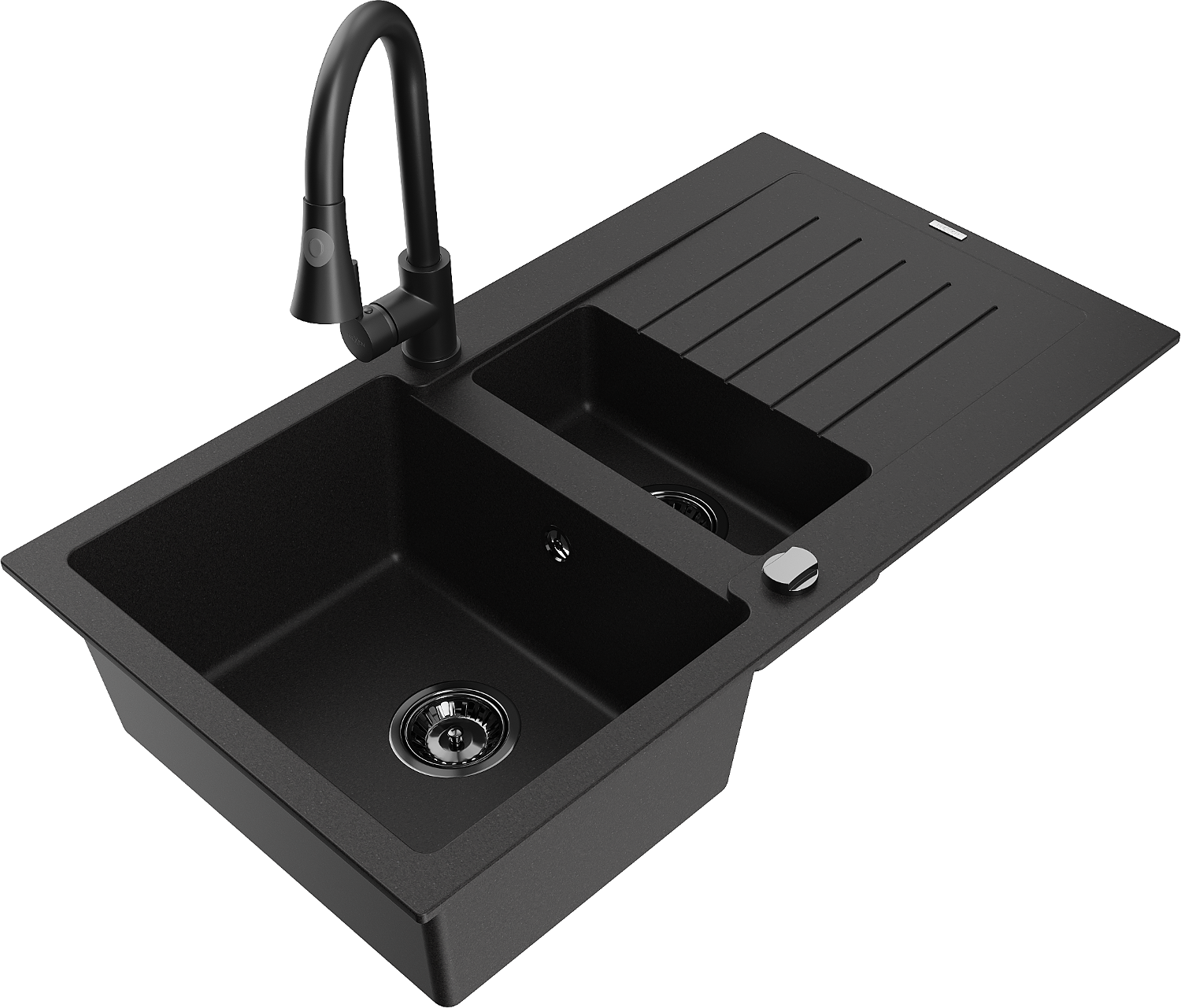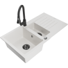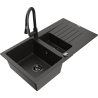 Mexen Matias lavello in granito da 1,5 vasche con scolapiatti e rubinetto da cucina Elia, nero - 6502-77-670101-70-B