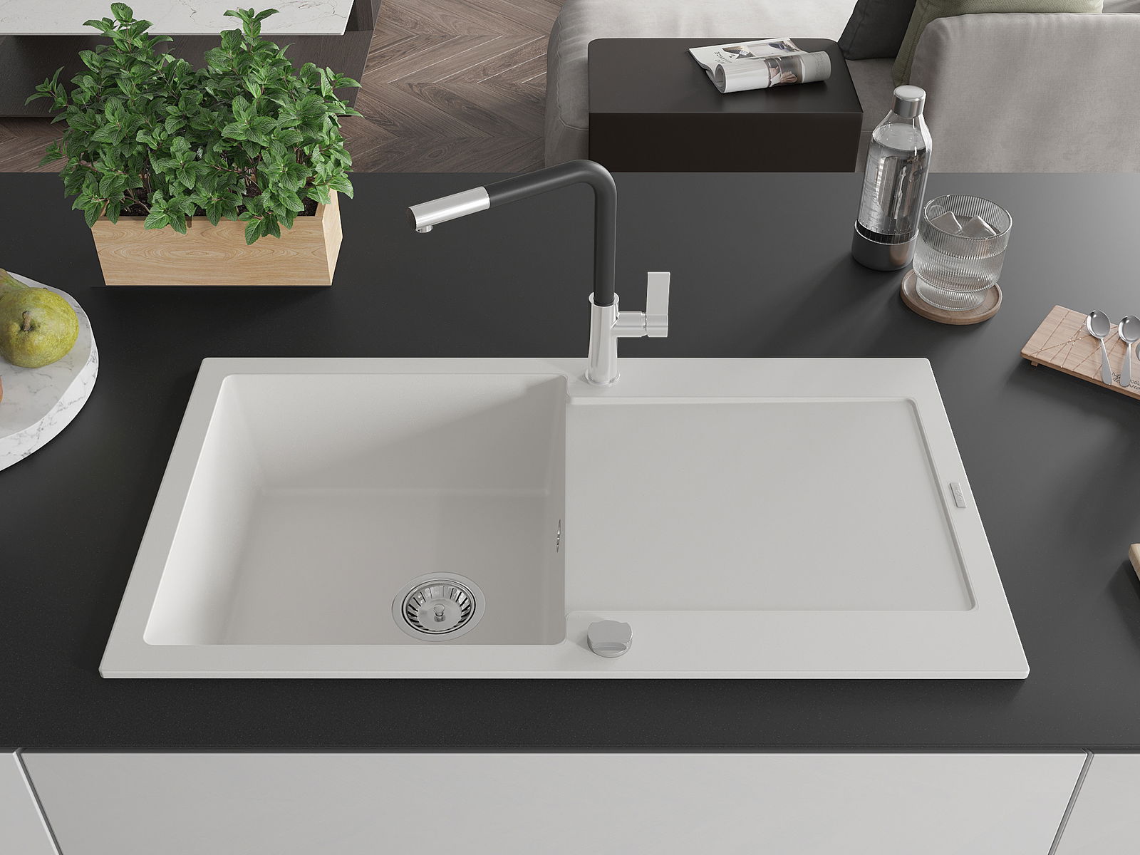 Mexen Leo lavello da cucina in granito con 1 vasca e scolapiatti e rubinetto da cucina Flora, bianco - 6501-20-670401-07