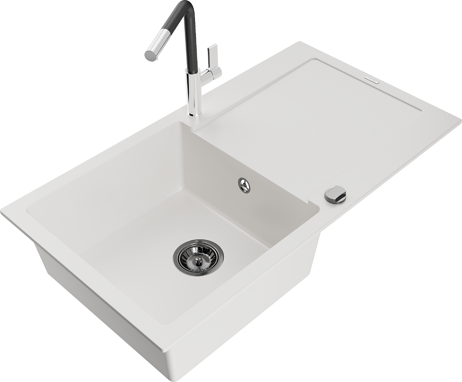 Mexen Leo lavello da cucina in granito monocamera con scolapiatti e rubinetto da cucina Flora, bianco - 6501-20-670401-07-B