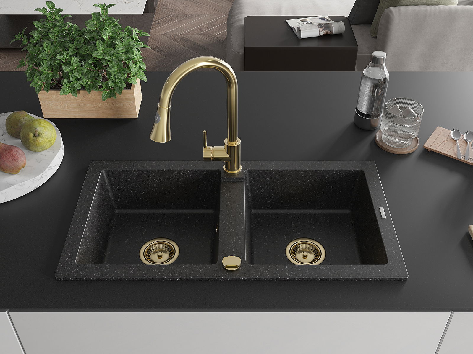 Mexen Mario lavello in granito a 2 vasche con miscelatore da cucina Elia, nero/argento metallizzato - 6504-73-670101-50