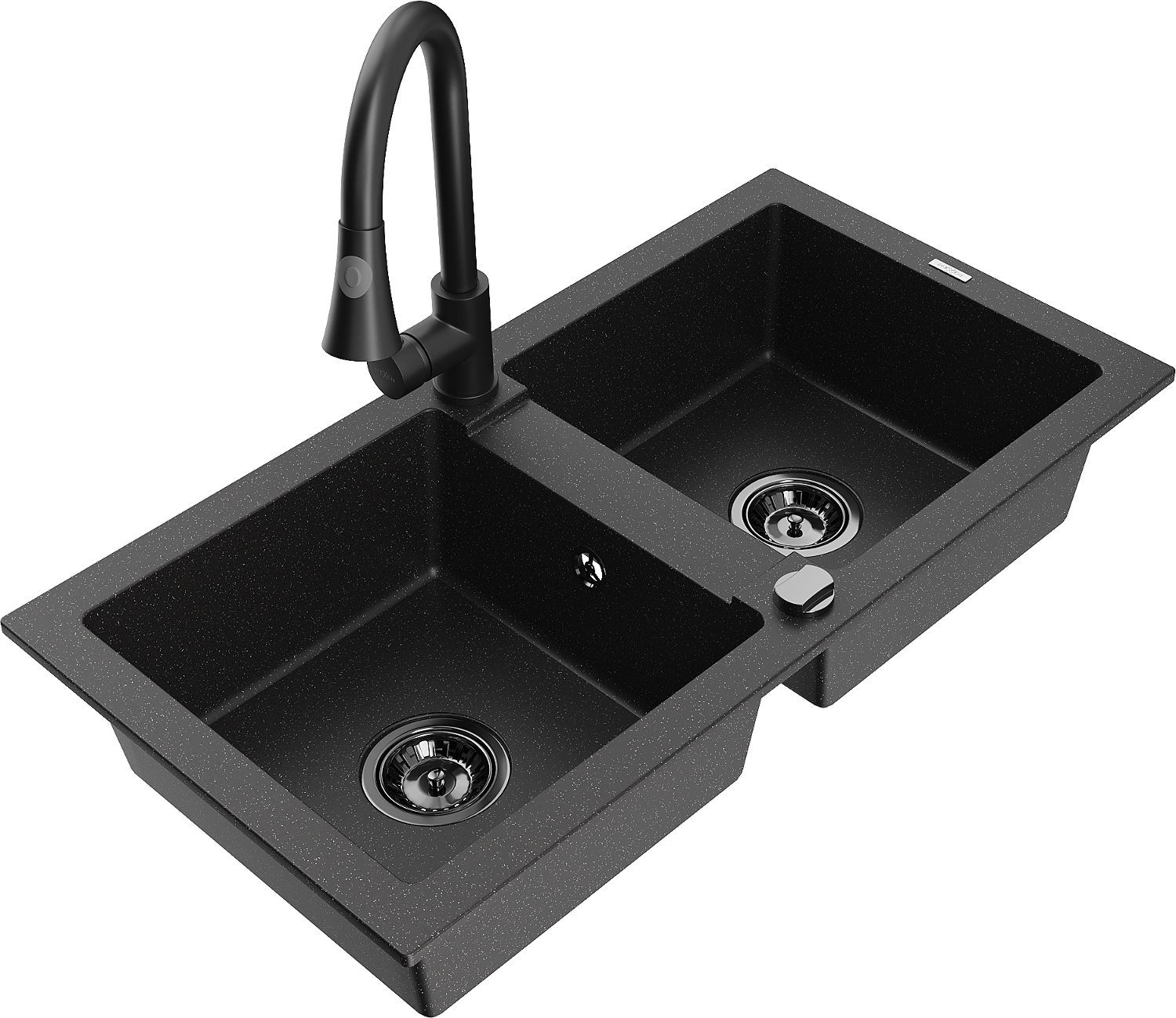 Mexen Mario lavello in granito a 2 vasche con rubinetto da cucina Elia, nero/metallizzato argento - 6504-73-670101-70-B