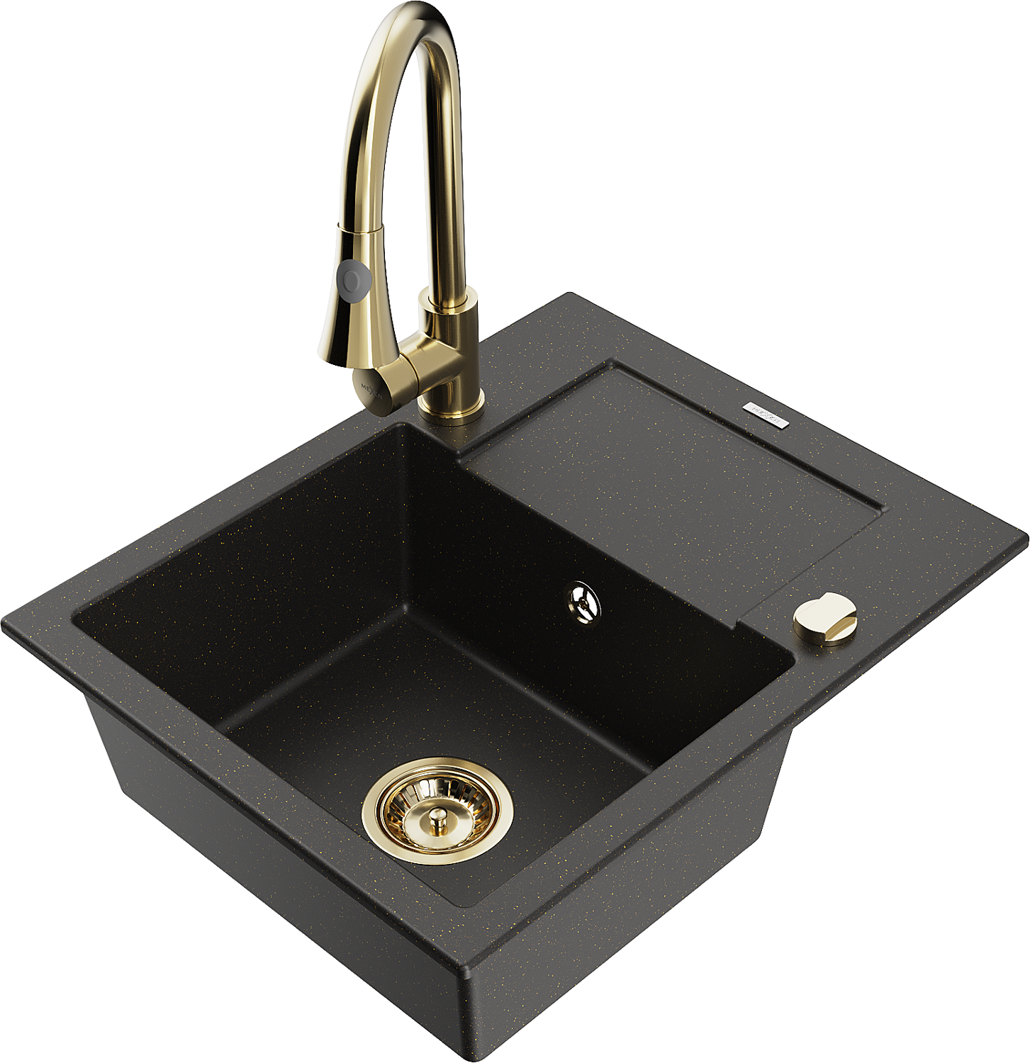 Mexen Enzo lavello in granito a 1 vasca con sgocciolatoio e rubinetto da cucina Elia, nero/oro metallizzato - 6506-75-670101-50